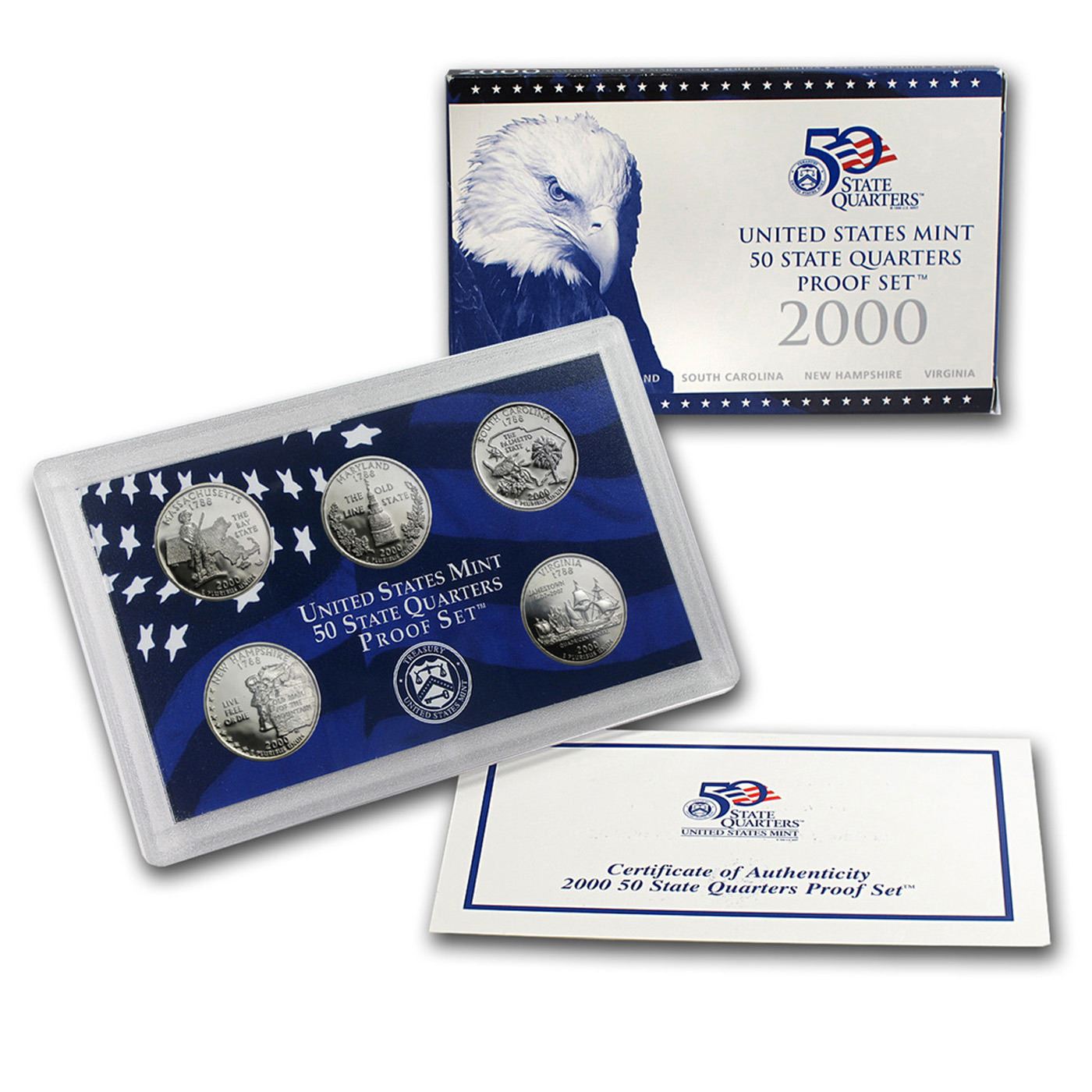 Group of 2 1999-2000 United States Quarters Proof Set - 10 pc set. 1999-2000 United States Quarters Proof Set - 10 pc set Low mintage. Each Set contains 5 Proof State Quarters. They are Delaware, Georgia, Pennsylvania, Connecticut, New Jersey, Massachusetts, Maryland, South Carolina, New Hampshire, and Virginia. Total of 10 pieces; Complete with Original Packaging and COA.