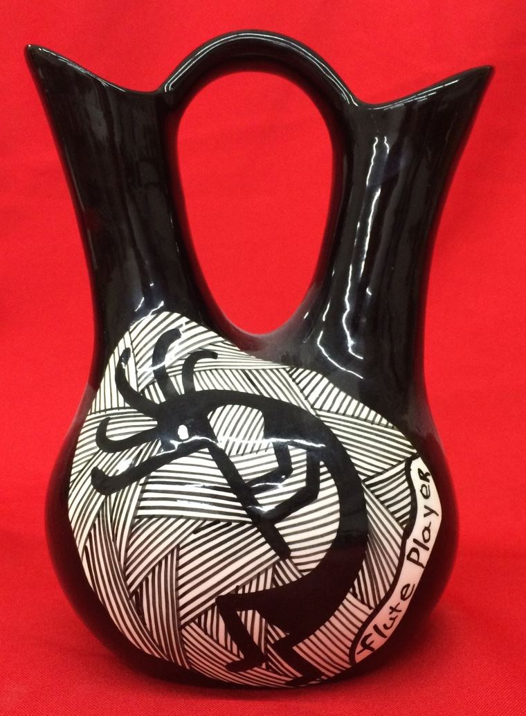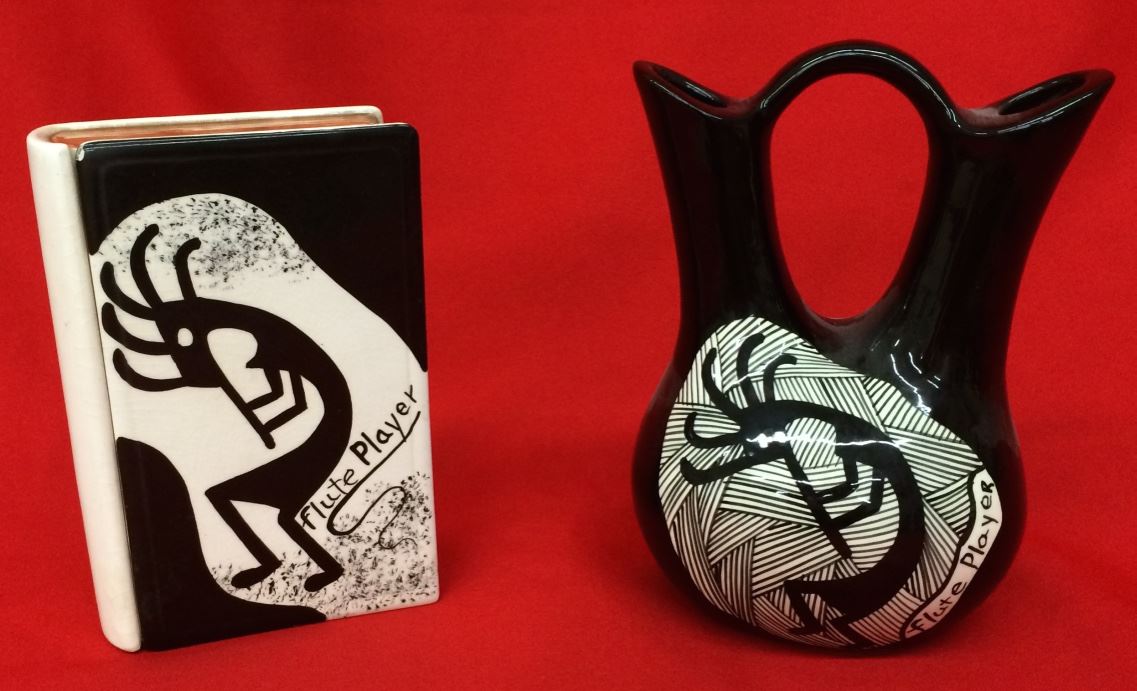 You get 2 pots for one money in this lot! Both have the Kokopelli (Flute Player) on them. The wedding vase is approx. 8” tall and the other piece is 4.5” X 7” X 1.5” deep. Both are in great condition.