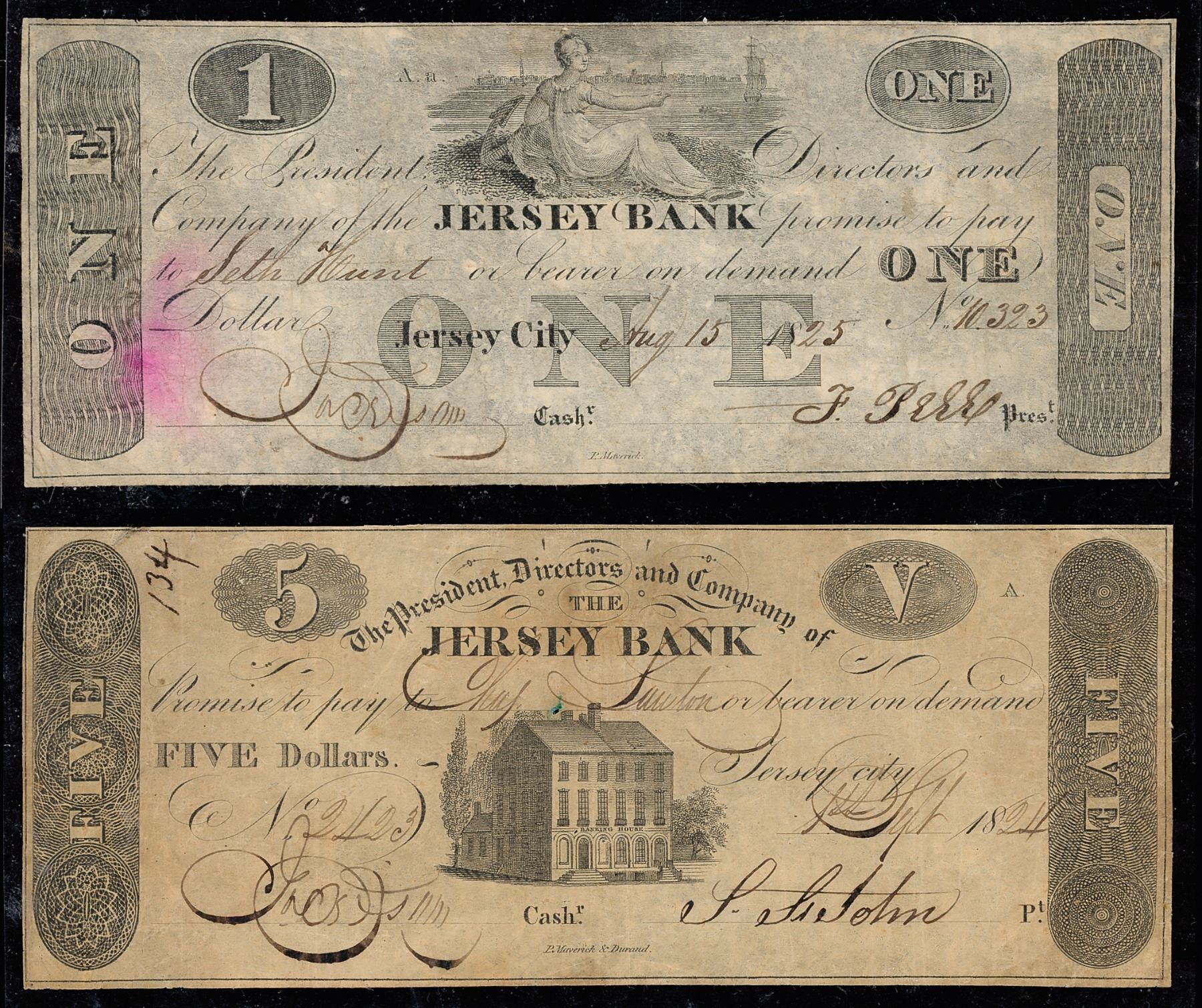group includes: Jersey City, New Jersey - Jersey Bank $1 Aug. 15, 1825 Fine; Jersey City, New Jersey - Jersey Bank $5 Sep. 1, 1824 Fine (has a hole) (2 notes total).
