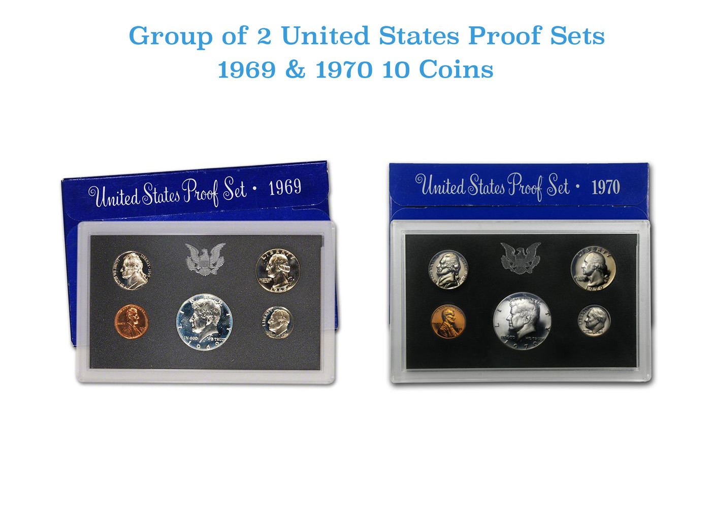 Group of 2 United States Mint Proof Sets 1969-1970. Contains 1970 Kennedy Half Dollar was struck in 40% silver. 10 coins. Group of 2 United States Proof Sets 1969-1970 10 coins. Each Set contains 5 Proof Coins, the Kennedy Half, Washington Quarter, Roosevelt Dime, Jefferson Nickel, and Lincoln Cent. Each coin was struck at the San Francisco Mint and carried the “S” mint mark. The groups of five coins were placed in a rigid plastic holder with the coins held in place by a black plastic insert, the holder was placed into a blue cardboard box.