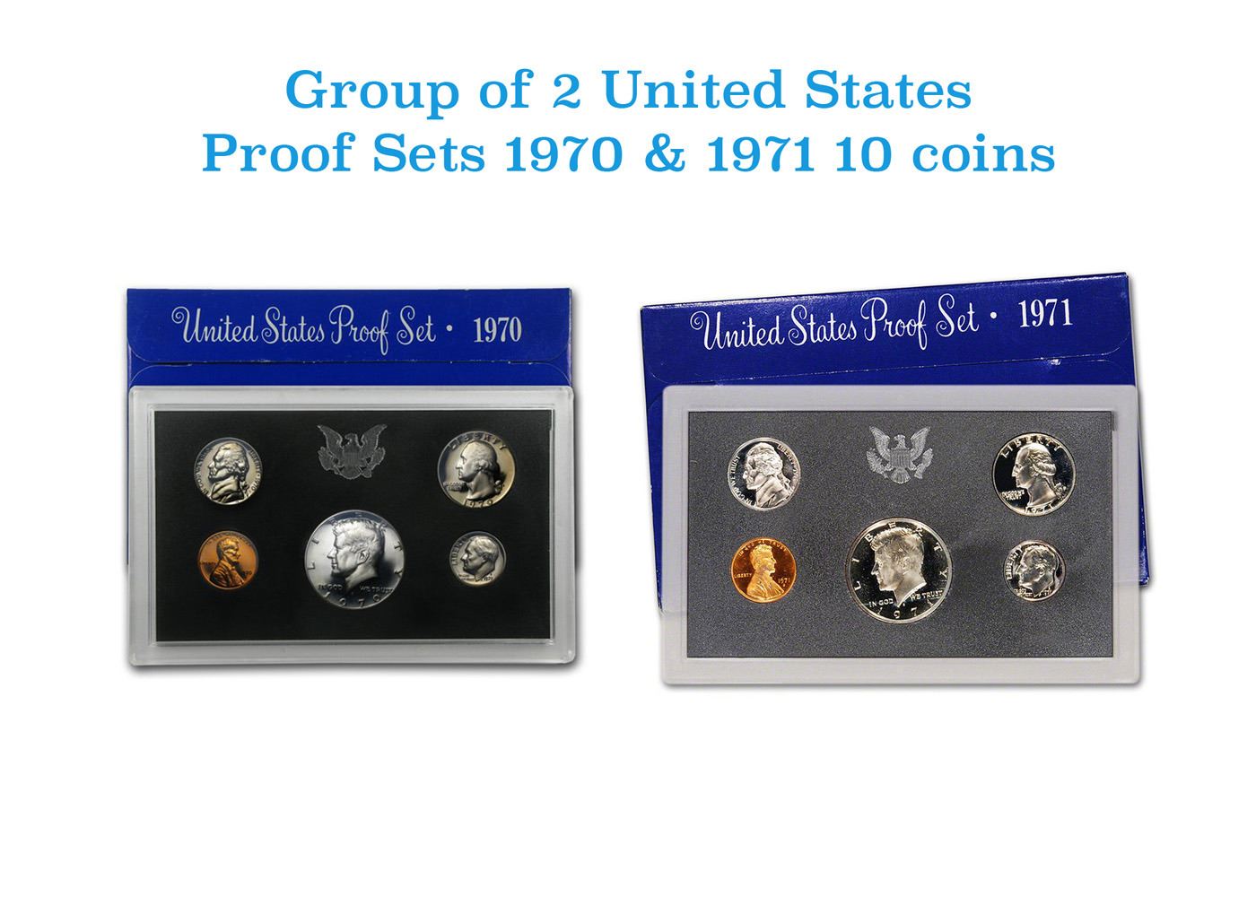 Group of 2 United States Mint Proof Sets 1970-1971. Containd 1970 Kennedy Half Dollar was struck in 40% silver. 10 coins. Group of 2 United States Proof Sets 1970-1971 10 coins. Each Set contains 5 Proof Coins, the Kennedy Half, Washington Quarter, Roosevelt Dime, Jefferson Nickel, and Lincoln Cent. Each coin was struck at the San Francisco Mint and carried the “S” mint mark. The groups of five coins were placed in a rigid plastic holder with the coins held in place by a black plastic insert, the holder was placed into a blue cardboard box. Some 1971 Proof Sets contain the 1971 “No S” Proof Jefferson Nickel, trend pr69DCAM $3650. These has not been check. An estimated 1,655 of the “No S” coin were produced. Some coins may be encountered with a cameo or deep cameo finish.