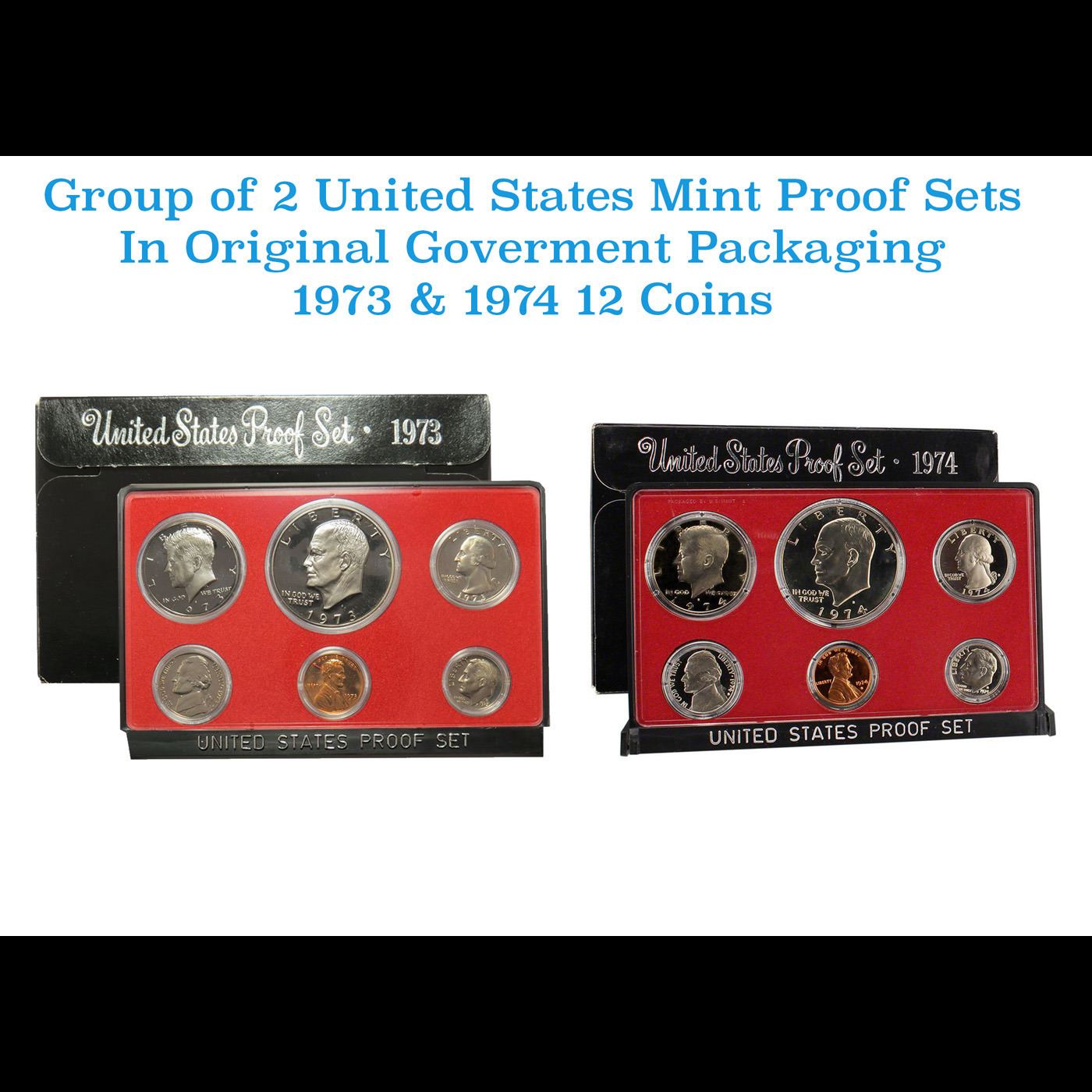 Group of 2 United States Mint Proof Sets 1973-1974 12 coins. Group of 2 United States Proof Sets 1973-1974 12 coins. Each set contain 6 coins, the Eisenhower Dollar, Kennedy Half Dollar, Washington Quarter, Roosevelt Dime, Jefferson Nickel, and Lincoln Cent. The coins came in a different style plastic holder, with each of the coins sealed in its own separate section. The plastic case had a flip top, which opens and closes to display the coins.