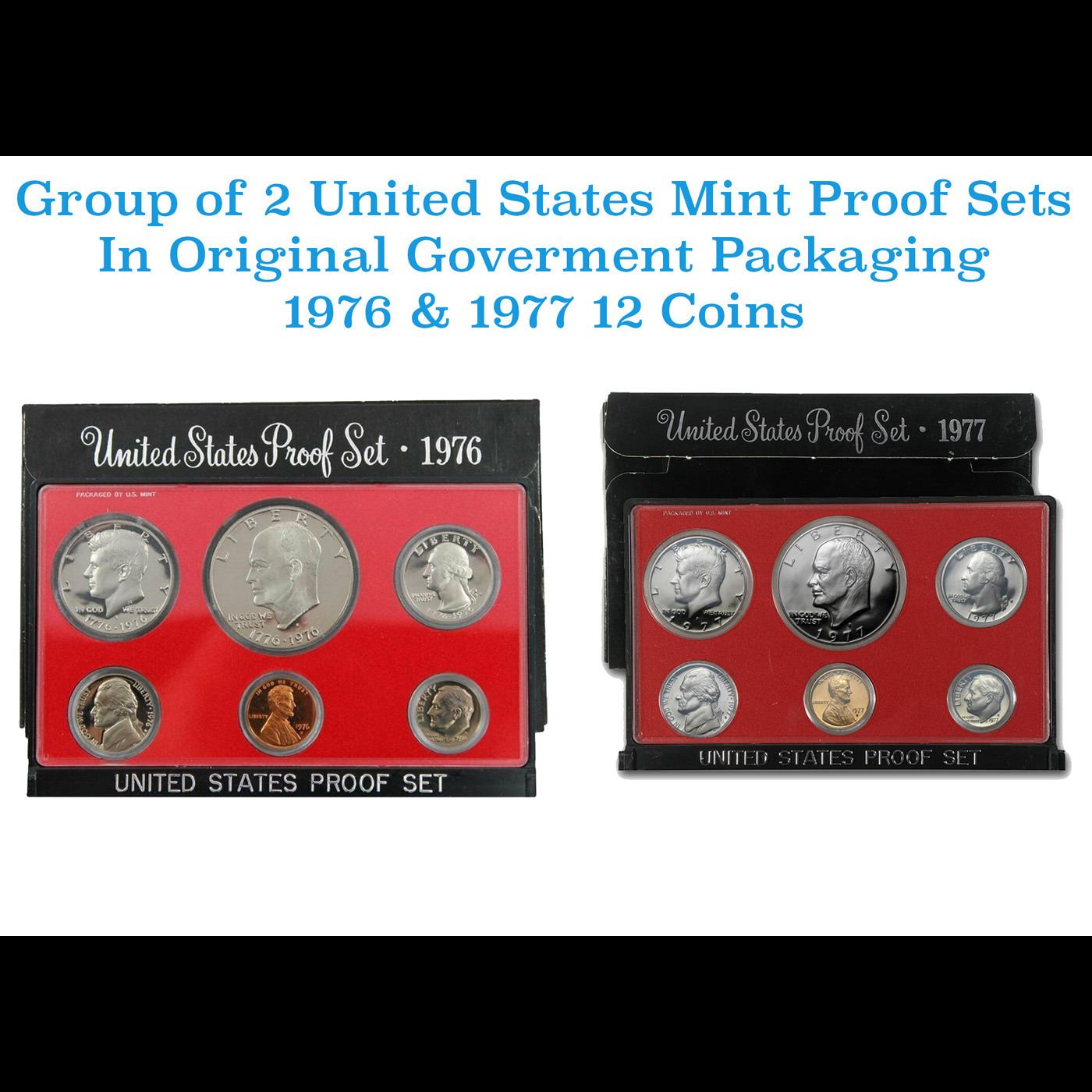 Group of 2 United States Mint Proof Sets 1976-1977 12 coins. Group of 2 United States Proof Sets 1976-1977 12 coins. Each Set contains 6 coins, Eisenhower Dollar, Kennedy Half Dollar, Washington Quarter, Roosevelt Dime, Jefferson Nickel, and Lincoln Centt. Each coin was struck at the San Francisco Mint and carried the “S” mint mark. The coins were placed within individual sealed rings against a red felt background. There was a black plastic outer cover which opens and closes. The outer cardboard box was colored black.
