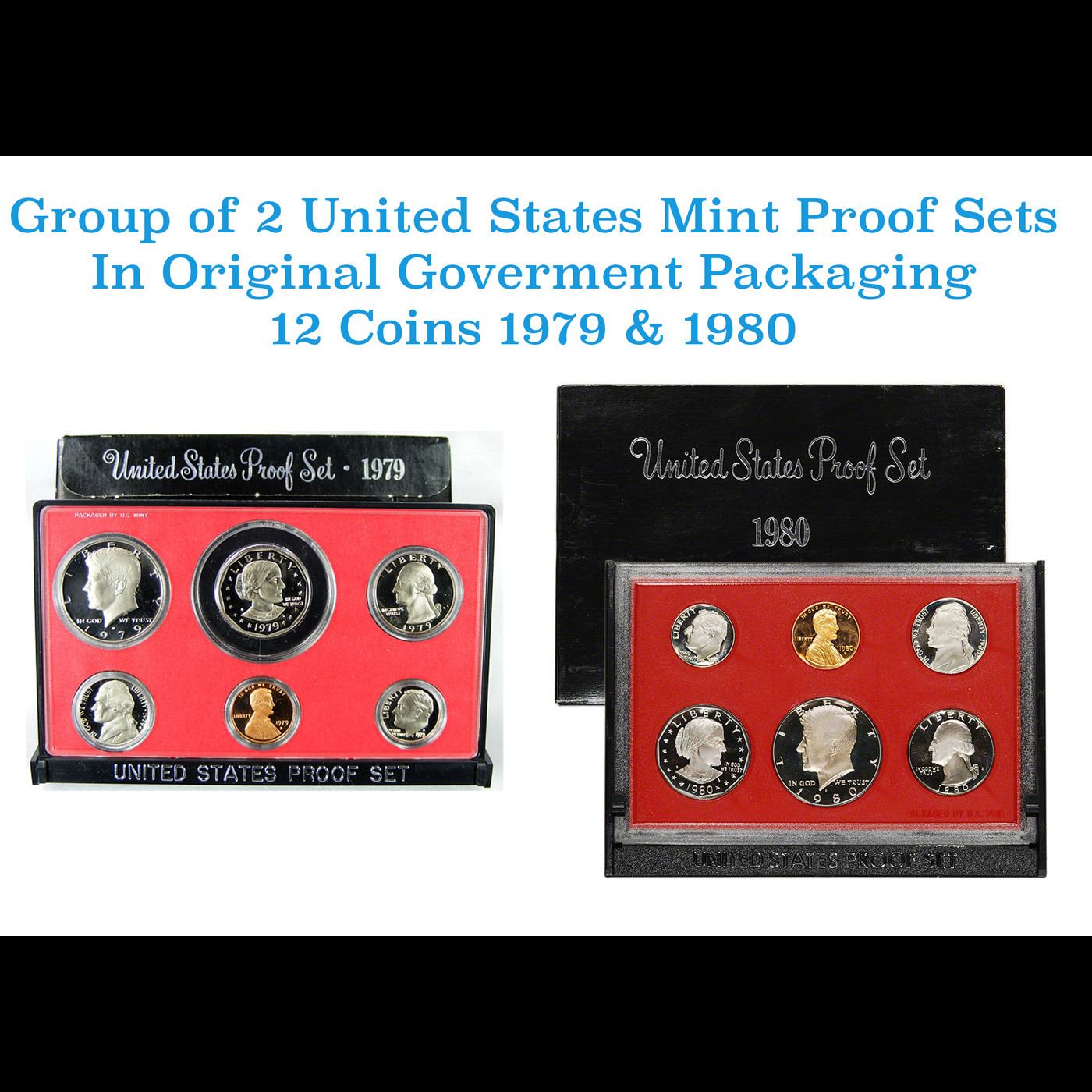Group of 2 United States Mint Proof Sets 1979-1980 12 coins. Group of 2 United States Proof Sets 1979-1980 12 coins. Each Set contains 6 coins Lincoln Cent, Jefferson Nickel, Roosevelt Dime, Washington Quarter, Kennedy Half Dollar, and Susan B. Anthony Dollar. All coins were minted at the San Francisco mint and carried the “S” mint mark. The proof coins are commonly found with attractive black and white deep cameo finishes. The packaging for the Proof Set was changed from the prior year. The primary plastic holder was smaller in size and the coins were no longer sealed in separate compartments. The coins were placed within slots of an internal red plastic piece, which was sealed between two clear plastic pieces. A black plastic sleeve slid over the plastic holder and could serve as a stand. The outer cardboard box was also changed. It had a single opening at the top for the main holder to slide into.