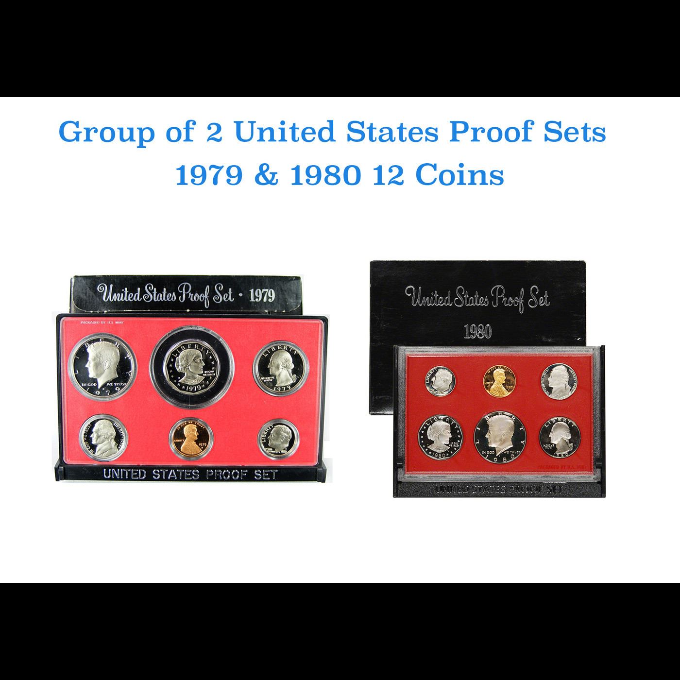 Group of 2 United States Mint Proof Sets 1979-1980 12 coins. Group of 2 United States Proof Sets 1979-1980 12 coins. Each Set contains 6 coins Lincoln Cent, Jefferson Nickel, Roosevelt Dime, Washington Quarter, Kennedy Half Dollar, and Susan B. Anthony Dollar. All coins were minted at the San Francisco mint and carried the “S” mint mark. The proof coins are commonly found with attractive black and white deep cameo finishes. The packaging for the Proof Set was changed from the prior year. The primary plastic holder was smaller in size and the coins were no longer sealed in separate compartments. The coins were placed within slots of an internal red plastic piece, which was sealed between two clear plastic pieces. A black plastic sleeve slid over the plastic holder and could serve as a stand. The outer cardboard box was also changed. It had a single opening at the top for the main holder to slide into.