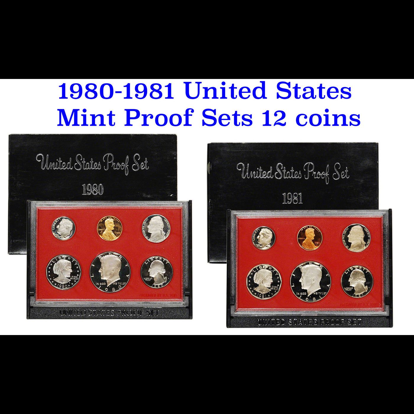 Group of 2 United States Mint Proof Sets 1980-1981 12 coins. Group of 2 United States Proof Sets 1980-1981 12 coins. Each Set contains 6 coins Lincoln Cent, Jefferson Nickel, Roosevelt Dime, Washington Quarter, Kennedy Half Dollar, and Susan B. Anthony Dollar. All coins were minted at the San Francisco mint and carried the “S” mint mark. The proof coins are commonly found with attractive black and white deep cameo finishes. The 1981 set had not been check for type 2 coins, 1981 Susan B. Anthony Type 1 trend ms69 $20 and type 2 trend ms69 $160. The packaging for the Proof Set was changed from the prior year. The primary plastic holder was smaller in size and the coins were no longer sealed in separate compartments. The coins were placed within slots of an internal red plastic piece, which was sealed between two clear plastic pieces. A black plastic sleeve slid over the plastic holder and could serve as a stand. The outer cardboard box was also changed. It had a single opening at the top for the main holder to slide into.