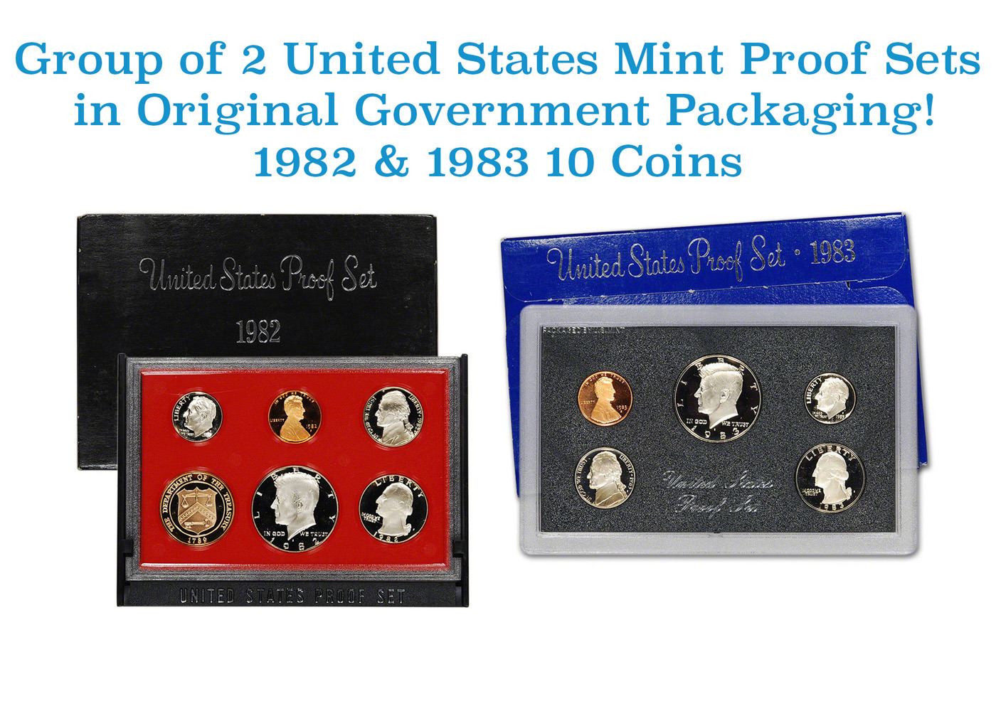 Group of 2 United States Mint Proof Sets 1982-1983 10 coins. Group of 2 United States Proof Sets 1982-1983 10 coins. Each Set contains 5 coins Kennedy Half Dollar, Washington Quarter, Roosevelt Dime, Jefferson Nickel, and Lincoln Cent. This was due to the removal of the Susan B. Anthony Dollar, which was no longer minted. For 1982, in place of the dollar coin was a token for the Department of the Treasury struck in bronze. We did not check for the 1983 “No S” Roosevelt Dimes were mint error. This error occurred as it had in the past and created a premium for any discoveries, trend pr69DCAM $875. Each proof coin was fit into a slot within a red plastic insert, which was sealed in a rigid clear plastic holder. An outer black plastic piece served to protect or display the set. The outer cardboard box was black and open at the top.
