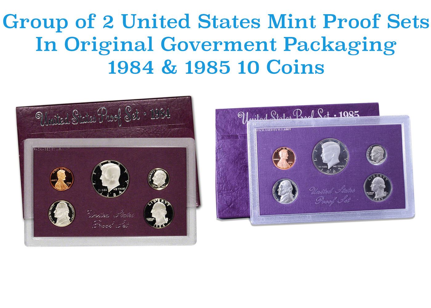 Group of 2 United States Mint Proof Sets 1984-1985 10 coins. Group of 2 United States Proof Sets 1984-1985 10 coins. Each Set contains 5 coins, the Kennedy Half, Washington Quarter, Roosevelt Dime, Jefferson Nickel, and Lincoln Cent. All coins were minted at the San Francisco Mint with the “S” mint mark. The packaging for the Proof Set was changed from prior years. The five coins were placed within individual holes in textured purple cardboard. This was sealed within a single plastic lens. The outer box was a matching shade of purple and had the words “United States Proof Set 19__” in silver printing.