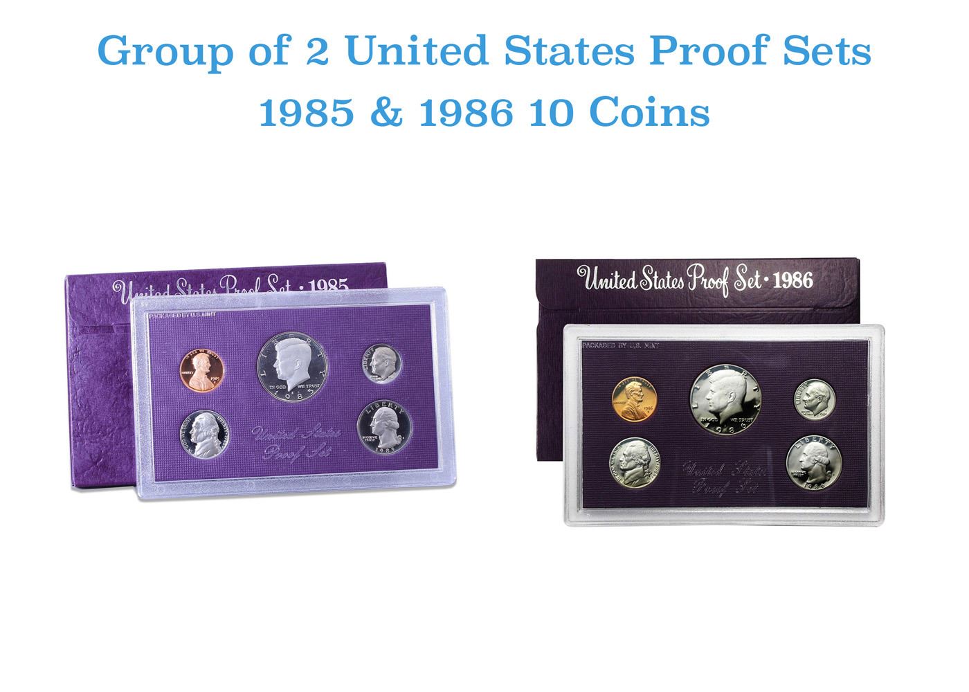 Group of 2 United States Mint Proof Sets 1985-1986 10 coins. Group of 2 United States Proof Sets 1985-1986 10 coins. Each Set contains 5 coins, the Kennedy Half, Washington Quarter, Roosevelt Dime, Jefferson Nickel, and Lincoln Cent. All coins were minted at the San Francisco Mint with the “S” mint mark. The five coins were placed within individual holes in textured purple cardboard. This was sealed within a single plastic lens. The outer box was a matching shade of purple and had the words “United States Proof Set 19__” in silver printing.