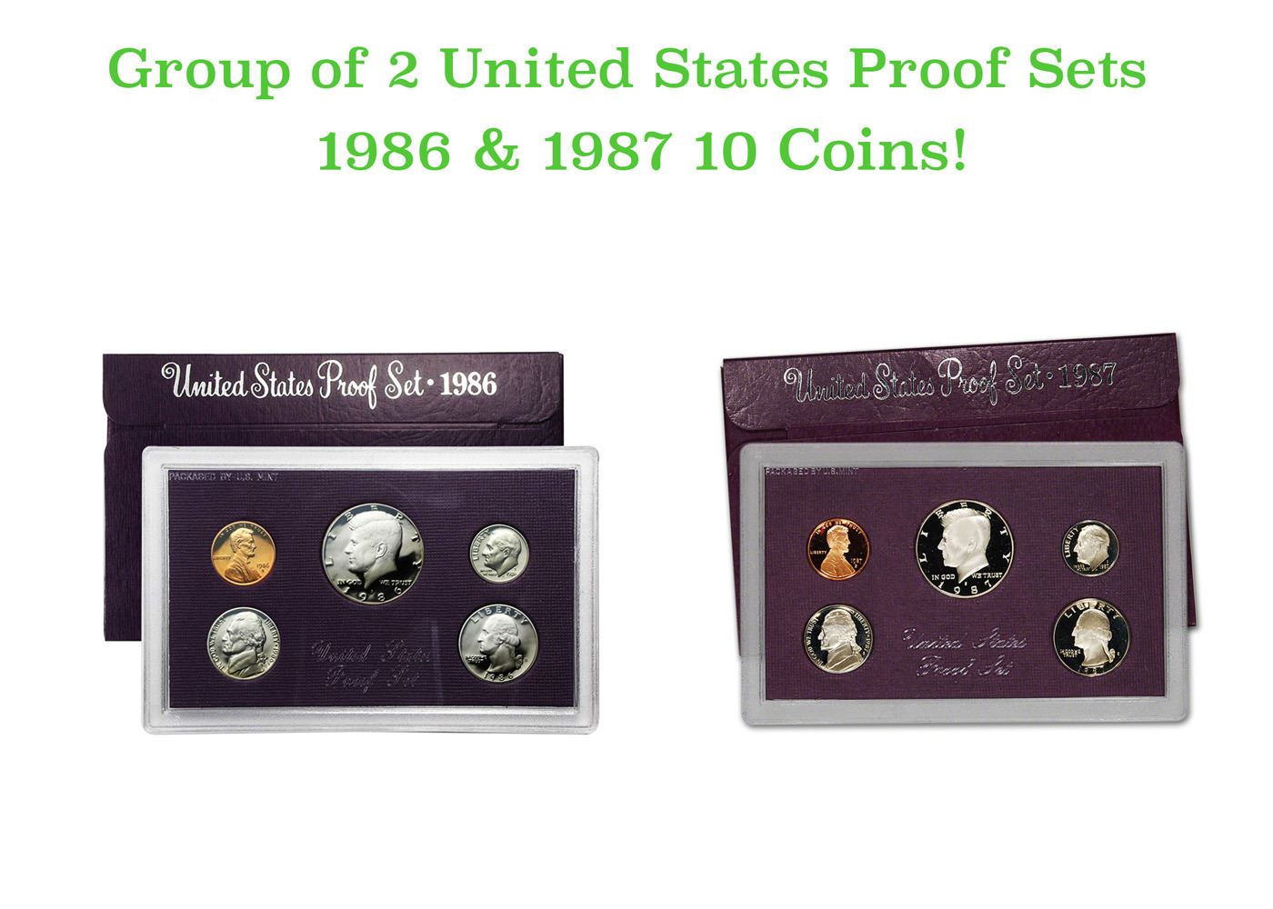 Group of 2 United States Mint Proof Sets 1986-1987 10 coins. Group of 2 United States Proof Sets 1986-1987 10 coins. Each Set contains 5 coins, the Kennedy Half, Washington Quarter, Roosevelt Dime, Jefferson Nickel, and Lincoln Cent. All coins were minted at the San Francisco Mint with the “S” mint mark. The five coins were placed within individual holes in textured purple cardboard. This was sealed within a single plastic lens. The outer box was a matching shade of purple and had the words “United States Proof Set 19__” in silver printing.
