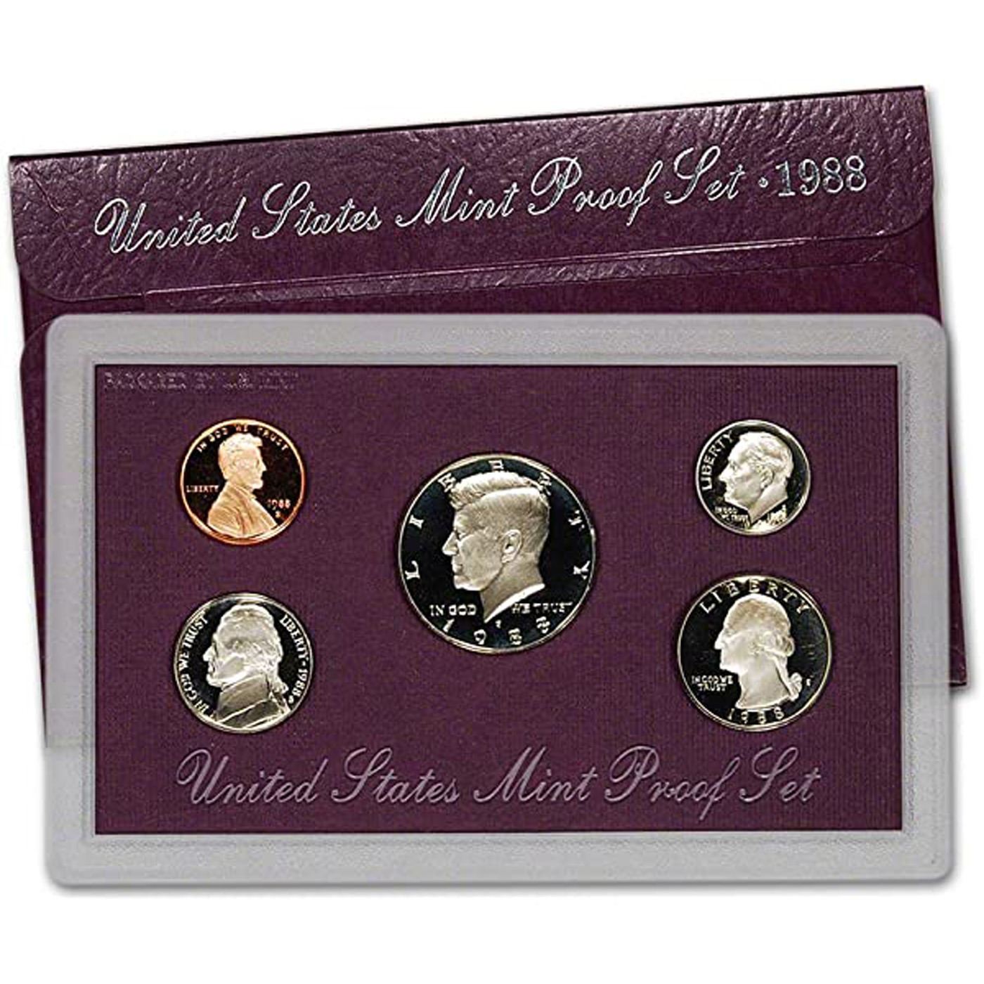 Group of 2 United States Mint Proof Sets 1987-1988 10 coins. Group of 2 United States Proof Sets 1987-1988 10 coins. Each Set contains 5 coins, the Kennedy Half, Washington Quarter, Roosevelt Dime, Jefferson Nickel, and Lincoln Cent. All coins were minted at the San Francisco Mint with the “S” mint mark. The five coins were placed within individual holes in textured purple cardboard. This was sealed within a single plastic lens. The outer box was a matching shade of purple and had the words “United States Proof Set 19__” in silver printing.