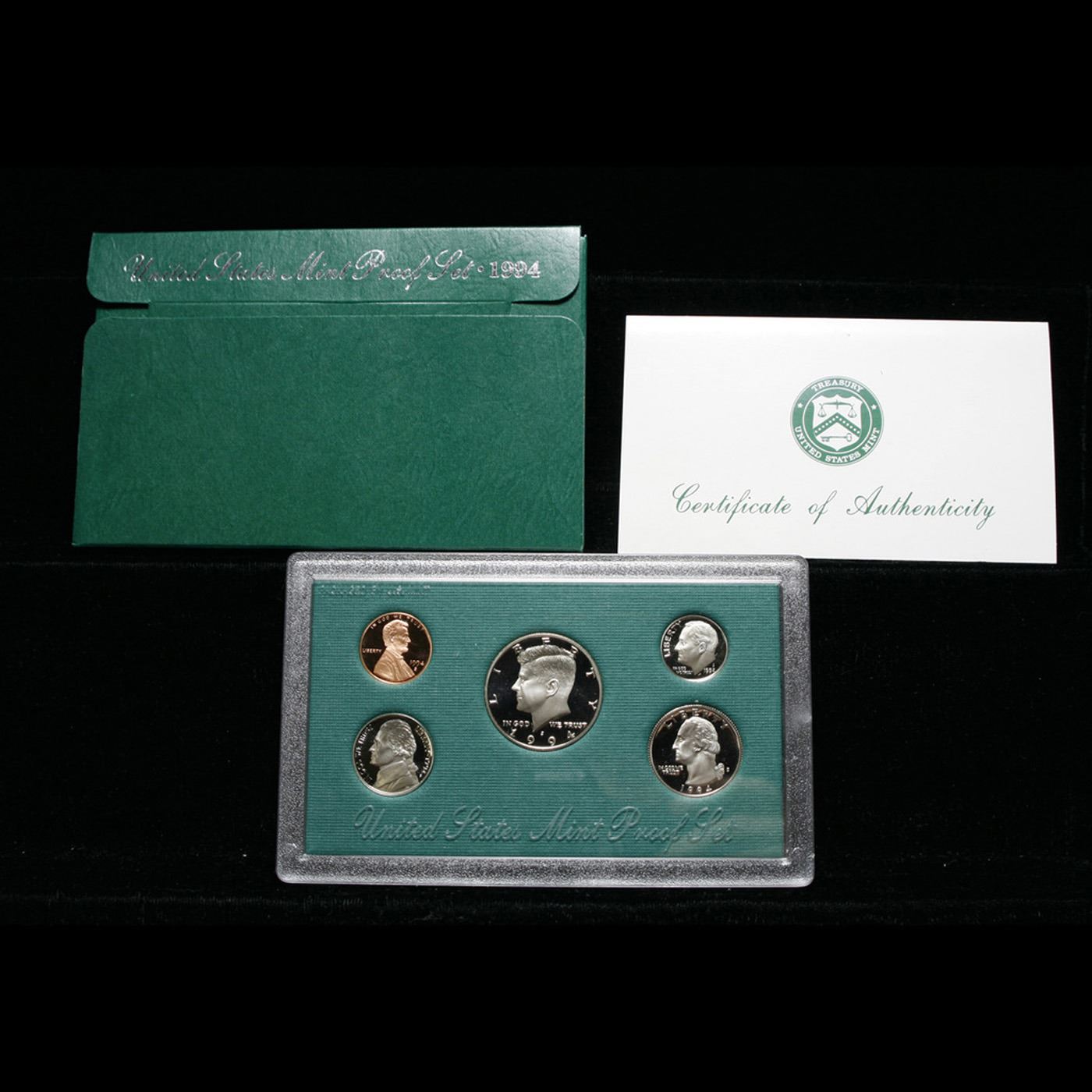 Group of 2 United States Mint Proof Sets 1993-1994 10 coins. Group of 2 United States Proof Sets 1993-1994 10 coins. Each Set contains 5 Proof Coins, the Kennedy Half, Washington Quarter, Roosevelt Dime, Jefferson Nickel, and Lincoln Cent. Each coin was struck at the San Francisco Mint and carried the “S” mint mark. The packaging for the 1993 set is theme in green and 1994 Proof Set was themed in purple. The coins were held in place within slots of a cardboard holder sealed in a plastic lens. This lens was placed in an outer cardboard box with silver printing on the outside.