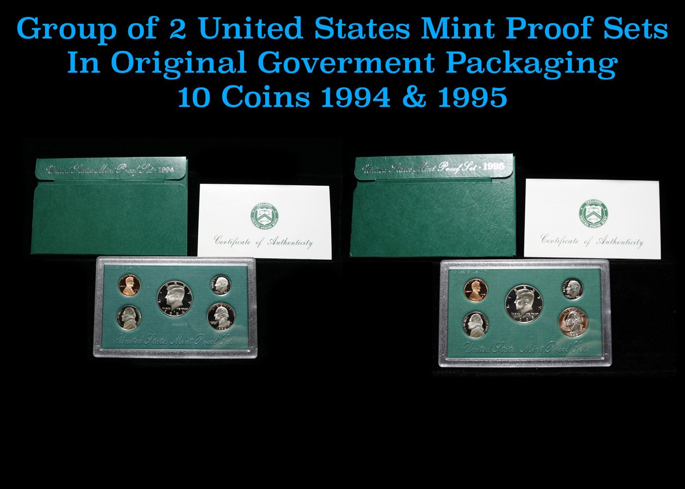Group of 2 United States Mint Proof Sets 1994-1995 10 coins.. Group of 2 United States Proof Sets 1994-1995 10 coins. Each Set contains 5 Proof Coins, the Kennedy Half, Washington Quarter, Roosevelt Dime, Jefferson Nickel, and Lincoln Cent. Each coin was struck at the San Francisco Mint and carried the “S” mint mark. he packaging had the coins fitted within a green colored cardboard inner holder and sealed in a plastic lens. This lens was placed within an outer green cardboard box with silver printing “United States Mint Proof Set 19__.”