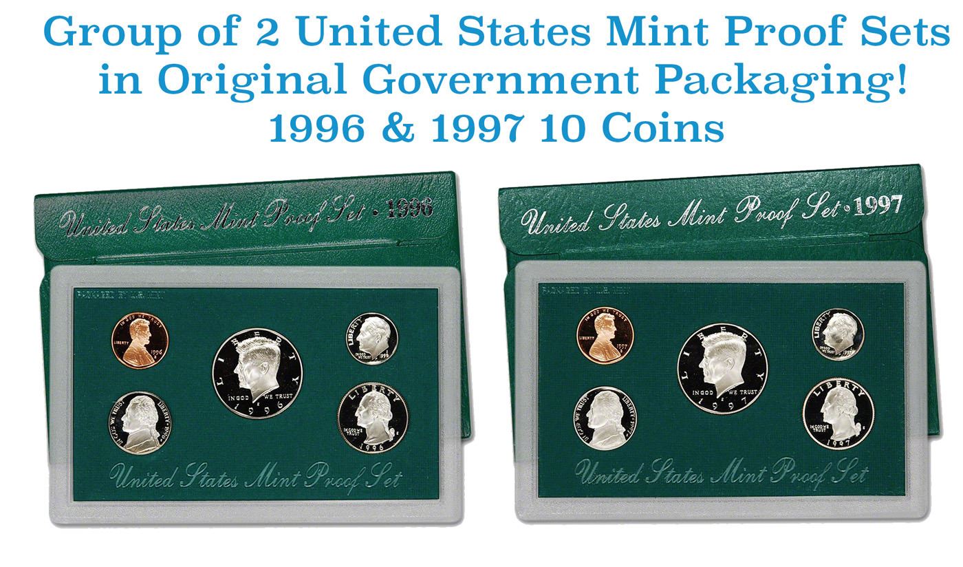 Group of 2 United States Mint Proof Sets 1996-1997 10 coins.. Group of 2 United States Proof Sets 1996-1997 10 coins. Each Set contains 5 Proof Coins, the Kennedy Half, Washington Quarter, Roosevelt Dime, Jefferson Nickel, and Lincoln Cent. Each coin was struck at the San Francisco Mint and carried the “S” mint mark. he packaging had the coins fitted within a green colored cardboard inner holder and sealed in a plastic lens. This lens was placed within an outer green cardboard box with silver printing “United States Mint Proof Set 19__.”
