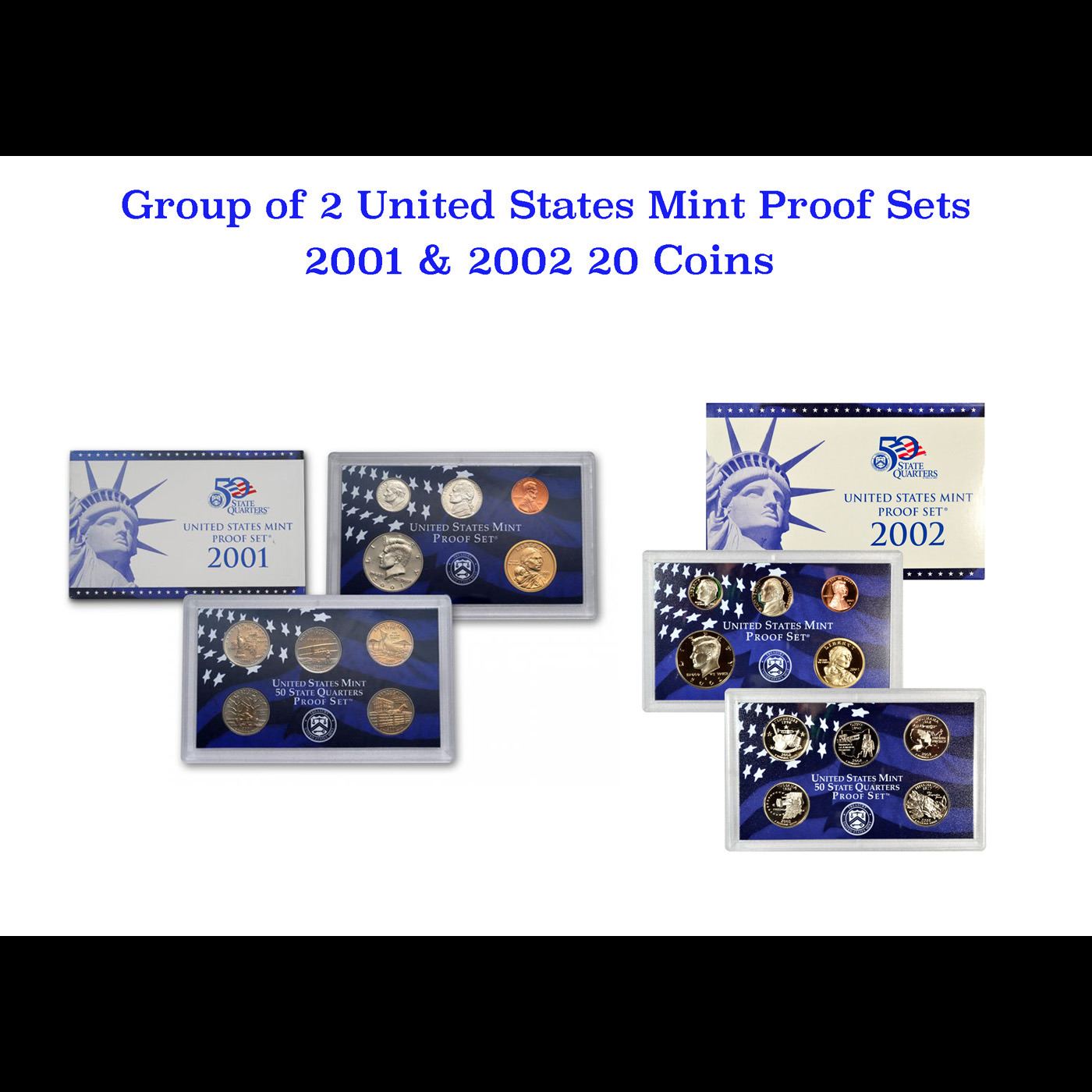 Group of 2 United States Mint Proof Sets 2001-2002 20 coins.. Group of 2 United States Proof Sets 2001-2002 20 coins. Each Set contains 10 coins, Sacagawea Dollar, Kennedy Half Dollar, Roosevelt Dime, Jefferson Nickel, and Lincoln Cent. Along side the State Quarters honoring New York, North Carolina, Rhode Island, Vermont, Kentucky, tennessee, Ohio, Louisiana, Indiana, and Mississippi. The dollar, half dollar, dime, nickel, and cent were sealed in one plastic lens, with the five State Quarters in a separate lens. These two lenses were placed in a cardboard box with an image of the Statue of Liberty and a blue color scheme. The outside of the box indicated the contents.