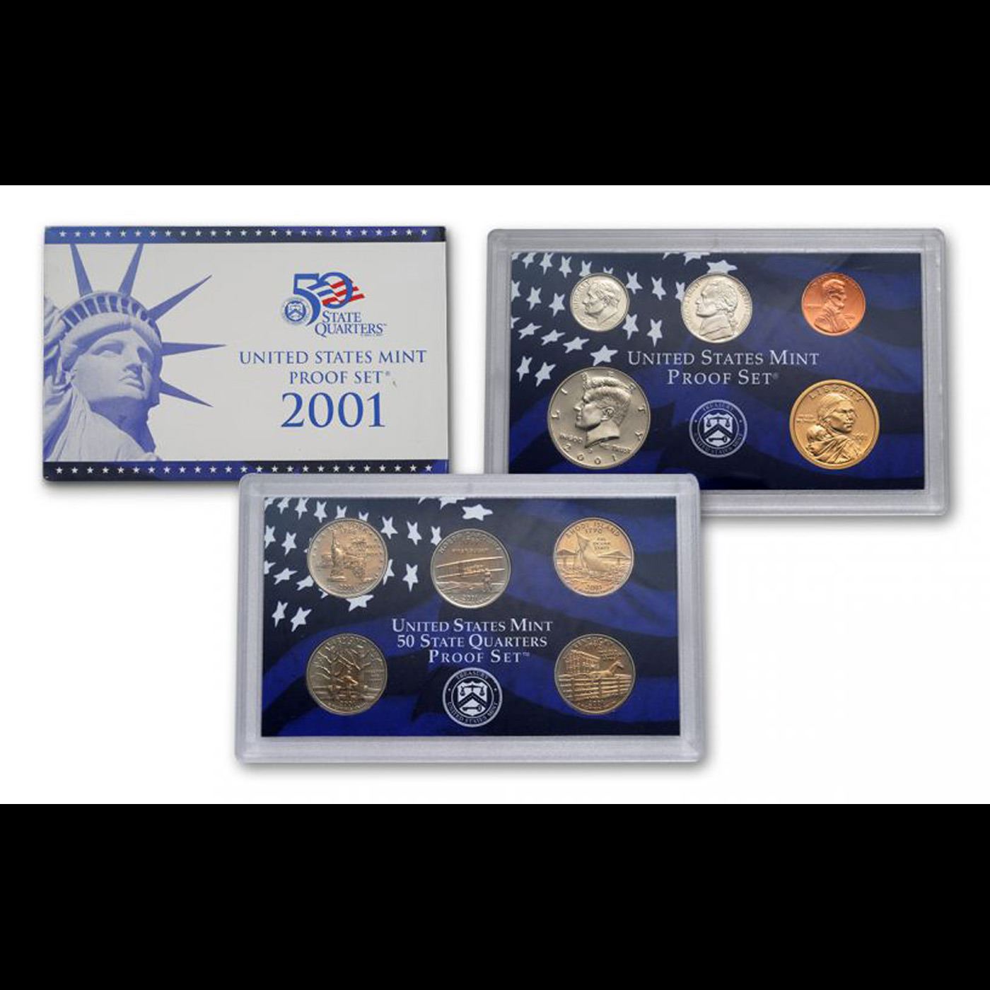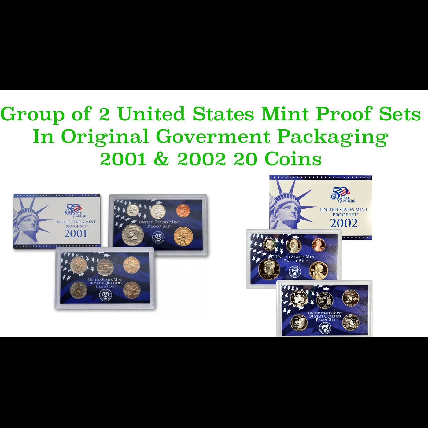 Group of 2 United States Mint Proof Sets 2001-2002 20 coins.. Group of 2 United States Proof Sets 2001-2002 20 coins. Each Set contains 10 coins, Sacagawea Dollar, Kennedy Half Dollar, Roosevelt Dime, Jefferson Nickel, and Lincoln Cent. Along side the State Quarters honoring New York, North Carolina, Rhode Island, Vermont, Kentucky, tennessee, Ohio, Louisiana, Indiana, and Mississippi. The dollar, half dollar, dime, nickel, and cent were sealed in one plastic lens, with the five State Quarters in a separate lens. These two lenses were placed in a cardboard box with an image of the Statue of Liberty and a blue color scheme. The outside of the box indicated the contents.