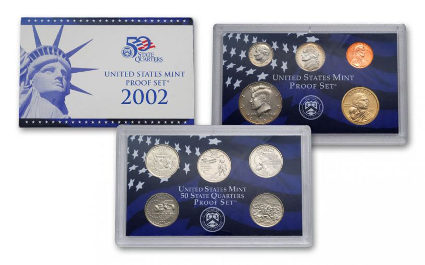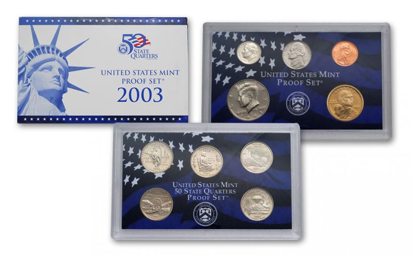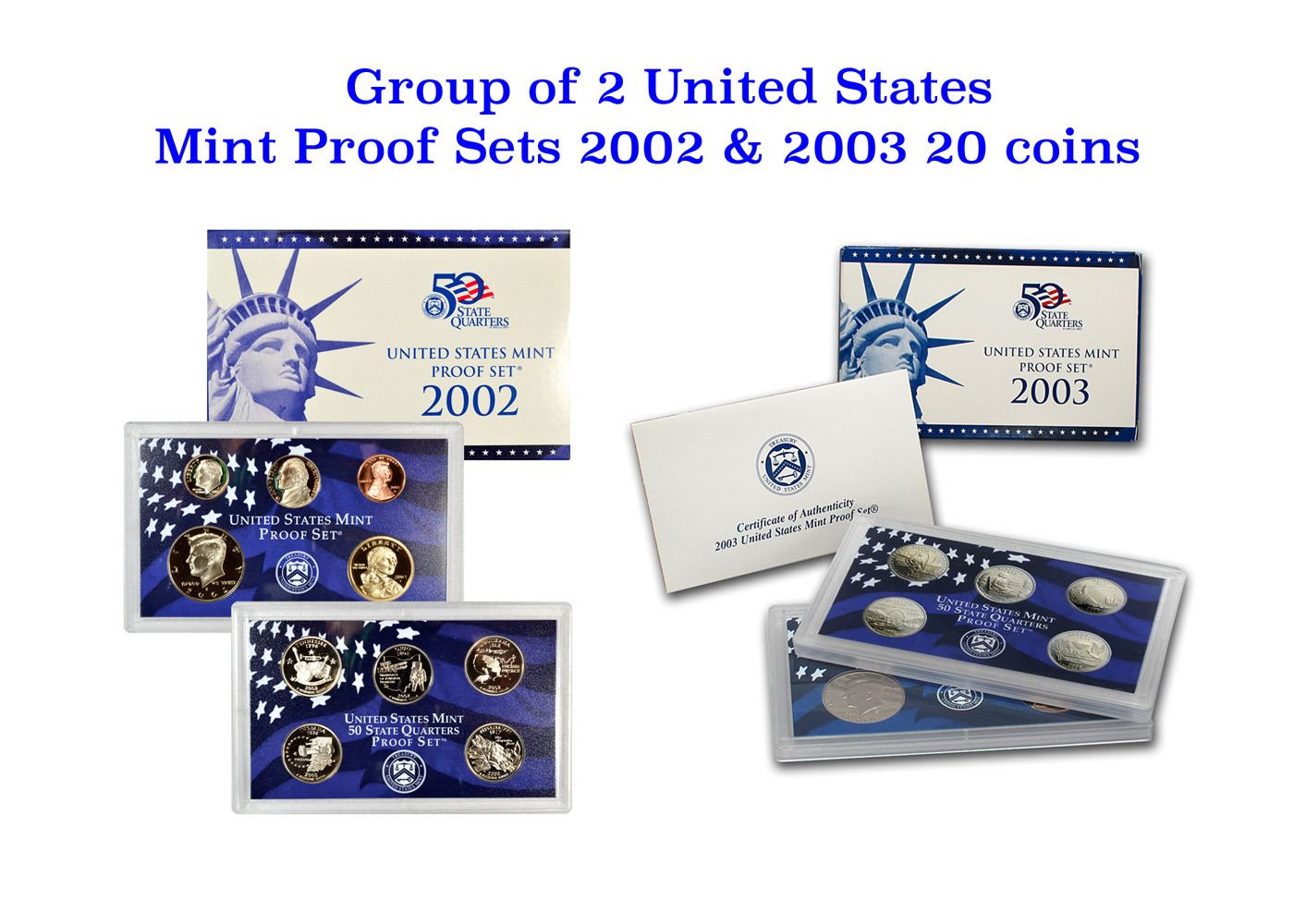 Group of 2 United States Mint Proof Sets 2002-2003 20 coins.. Group of 2 United States Proof Sets 2002-2003 20 coins. Each Set contains 10 coins, Sacagawea Dollar, Kennedy Half Dollar, Roosevelt Dime, Jefferson Nickel, and Lincoln Cent. Along side the State Quarters honoring Tennessee, Ohio, Louisiana, Indiana, Mississippi, Illinois, Alabama, Maine, Missouri, and Arkansas .The dollar, half dollar, dime, nickel, and cent were sealed in one plastic lens, with the five State Quarters in a separate lens. These two lenses were placed in a cardboard box with an image of the Statue of Liberty and a blue color scheme. The outside of the box indicated the contents.