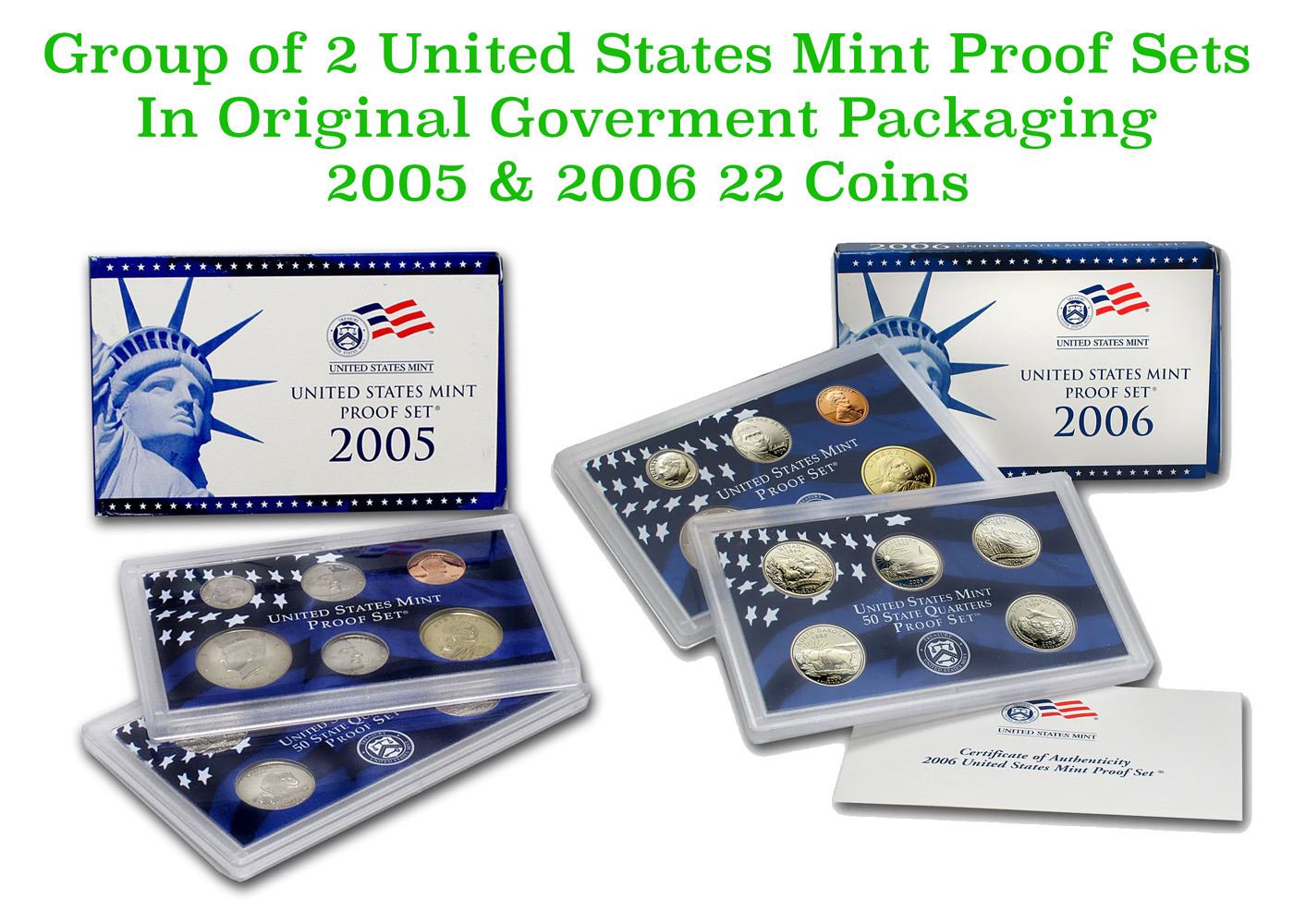 Group of 2 United States Mint Proof Sets 2005-2006 21 coins.. Group of 2 United States Proof Sets 2005-2006 21 coins. The 2005 Proof Set was the second year that the annual proof set contained contained 11 coins. The increased number of coins was due to the Westward Journey series, which issued two nickels. Each set included the five 2005 State Quarters honoring California, Minnesota, Oregon, Kansas, and West Virginia. The two Westward Journey Nickels featured the American Bison and the Ocean in View. The remaining coins were the Sacagawea Dollar, Kennedy Half Dollar, Roosevelt Dime, and Lincoln Cent. The number of coins went down to 10 in the 2006 Proof Set this year due to the Jefferson Nickel using a permanent new obverse design paired with the classic Monticello reverse. Each 2006 Proof Set contained the five 2006 Sate Quarters honoring Nevada, Nebraska, Colorado, North Dakota, and South Dakota. This represented the eighth year of the series and the thirty-fifth to fortieth states to join the Union. The remaining coins were the 2006-dated Sacagawea Dollar, Kennedy Half, Roosevelt Dime, Jefferson Nickel, and Lincoln Cent. Packaging for the Proof Sets remained the same as established for the launch of the State Quarters Program in 1999. The Statue of Liberty appears on blue color schemed outer box. The coins inside are sealed in two separate plastic lenses with a certificate of authenticity.