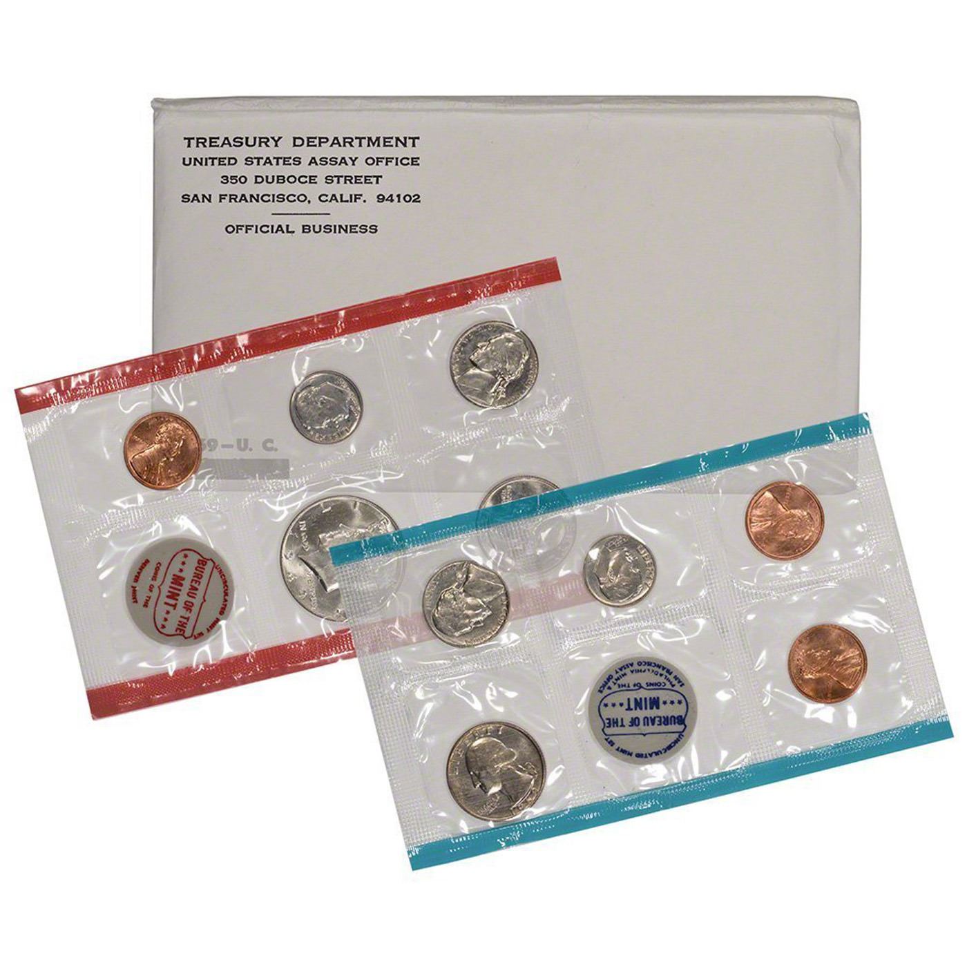 Group of 2 United States Mint Set in Original Government Packaging! From 1968-1969 with 20 Coins Inside!. Group of 2 United State Mint Set from 1968-1969 included a total of 20 coins struck at three different mint facilities. Each set comprised of Lincoln Cents (P, D, S), Jefferson Nickels (D, S), Roosevelt Dimes (P, D), Washington Quarters (P, D), and one Kennedy Half Dollar (D). Notably, the half dollar included in the set was struck in a composition of 40% silver. The Philadelphia Mint coins and the single Lincoln Cent struck at the San Francisco Mint were placed within a cellophane pack with a blue stripe and the Denver Mint coins were placed in a pack with a red stripe. The two were placed between sheets of light cardboard within a white envelope marked “19__ U.C.” with the Treasury Department address.