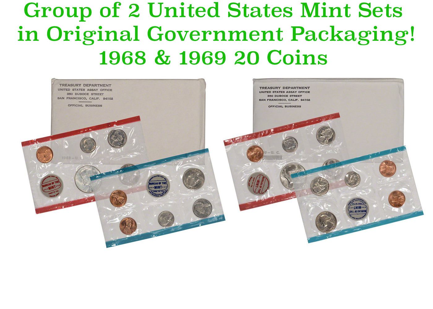 Group of 2 United States Mint Set in Original Government Packaging! From 1968-1969 with 20 Coins Ins