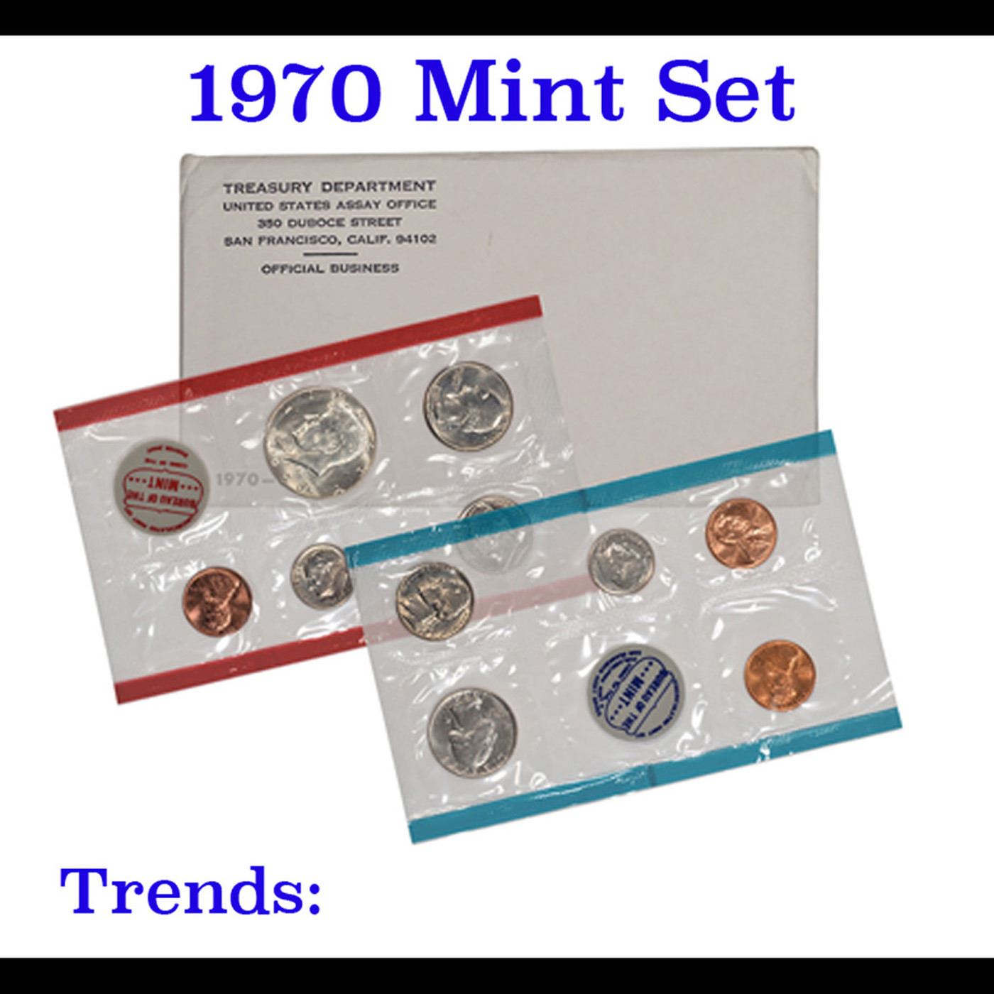 Group of 2 United States Mint Set in Original Government Packaging! From 1970-1971 with 21 Coins Inside!. Group of 2 United State Mint Set from 1970-1971 included a total of 21 coins struck at three different mint facilities. Each set comprised of Lincoln Cents (P, D, S), Jefferson Nickels (D, S), Roosevelt Dimes (P, D), Washington Quarters (P, D), and one Kennedy Half Dollar in the 1970 set was struck in a composition of 40% silver and importantly was not issued for circulation. This created a low mintage key date for the recently released series and a draw for many collectors. The 1971 set contain 2 Kennedy Half Dollar (P,D). The Philadelphia Mint coins and the single Lincoln Cent struck at the San Francisco Mint were placed within a cellophane pack with a blue stripe and the Denver Mint coins were placed in a pack with a red stripe. The two were placed between sheets of light cardboard within a white envelope marked “19__ U.C.” with the Treasury Department address.