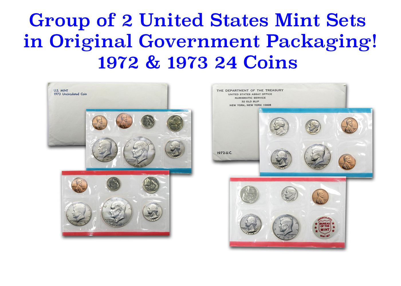 Group of 2 United States Mint Set in Original Government Packaging! From 1972-1973 with 24 Coins Inside!. Group of 2 United State Mint Set from 1972-1973 included a total of 24 coins struck at three different mint facilities. Each set is comprised of three Lincoln Cents (P, D, S), two Jefferson Nickels (P, D), two Roosevelt Dimes (P, D), two Washington Quarters (P, D), two Kennedy Half Dollars (P, D). On top of that, for first time, dollar coins were included in a government packaged uncirculated coin set, the 1973 Mint Set included the Eisenhower Dollars struck at the Philadelphia and Denver Mints, notably the Eisenhower Dollars were not issued for circulation, creating a low mintage key date for the series. For the 1972 Sets, the Denver Mint coins and plastic disc were placed in a cellophane marked with a red stripe and the Philadelphia and San Francisco Mint coins were placed in a separate cellophane with a blue stripe. Together they were placed between two cardboard inserts and placed within a white envelope. For the 1973 set the five Denver Mint coins were included in one cellophane with red edges. The six Philadelphia Mint and one San Francisco Mint coin were included in a separate cellophane with blue edges. Both were placed between light cardboard within a white envelope with markings indicating “U.S. Mint” and “1973 Uncirculated Coin”. This was a change from prior years of issue.
