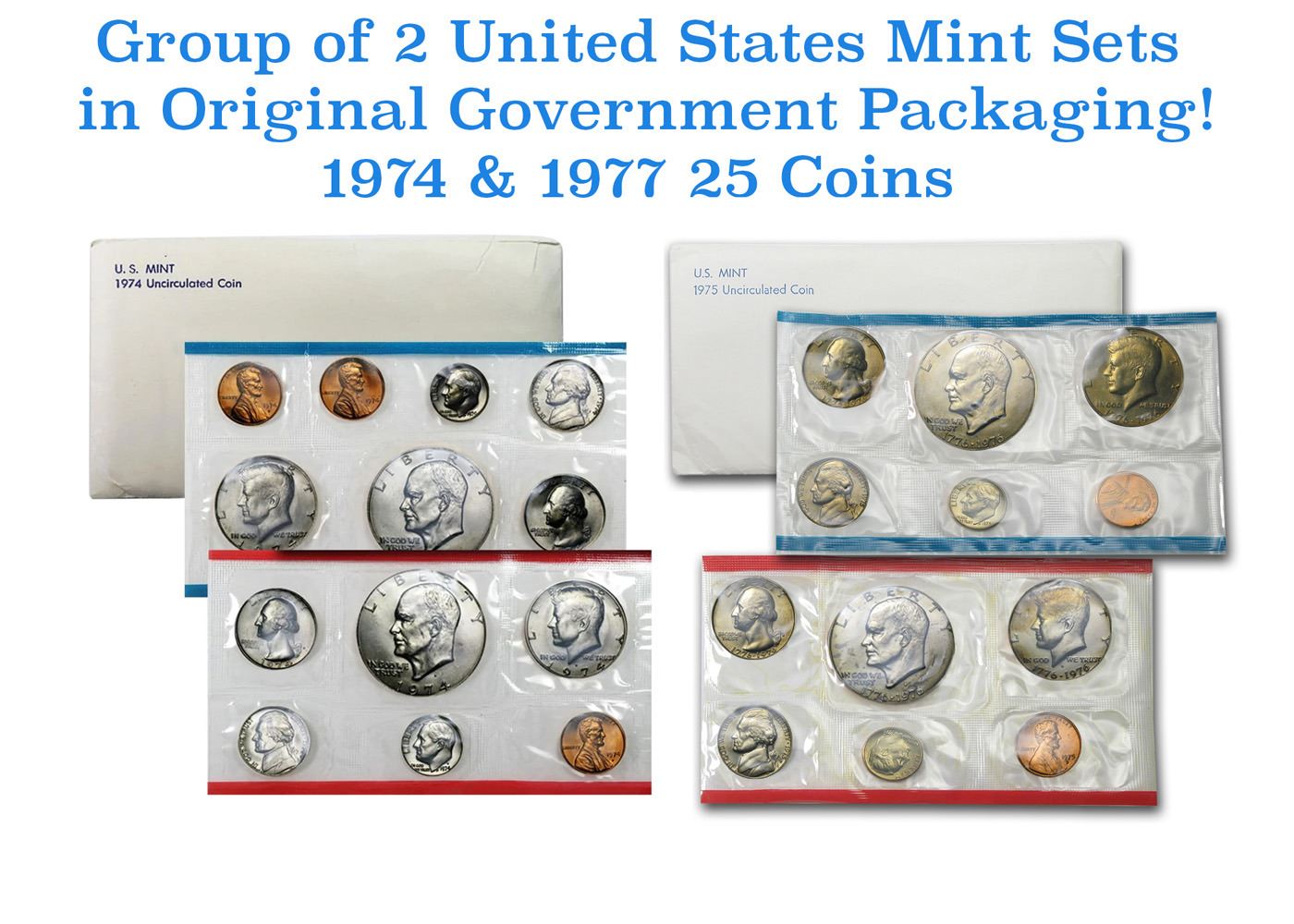 Group of 2 United States Mint Set in Original Government Packaging! From 1974-1975 with 25 Coins Inside!. Group of 2 United State Mint Set from 1974-1975 included a total of 25 coins struck at three different mint facilities. Each 1974 Mint Set contained three Lincoln Cents (P-D-S), two Jefferson Nickels (P-D), two Roosevelt Dimes (P-D), two Washington Quarters (P-D), two Kennedy Half Dollars (P-D), and two Eisenhower Dollars (P-D). Coins included in the set were primarily struck at the Philadelphia and Denver Mint facilities with only the one cent coin also struck at San Francisco. Notably, this would be the last year that San Francisco minted coins would be included in the annual uncirculated mint set. Packaging kept the same format with the P and S minted coins in a cellophane flat pack with blue striping and the D minted coins in a pack with red striping. These were placed between cardboard and within an envelope marked at the upper left corner with “U.S. Mint” and “1974 Uncirculated Coin”. The 1975 Mint Set remains a unique issue during the course of the annual set offering from the United States Mint. It is the only Mint Set that includes coins bearing a date different than the date of the set. This is due to the fact that 1975-dated quarters, half dollars, and dollar coins were not produced. To celebrate America’s upcoming Bicentennial, these denominations would be issued with a new reverse design and the dual date “1776-1976”. In anticipation of high demand for the coins, production began in 1975. Accordingly, the bicentennial coins were included in the 1975 Uncirculated Mint Set. Another unique aspect of this set is that it only includes coins from the Philadelphia and Denver Mints. Starting this year, the San Francisco Mint no longer produced coins for circulation bearing the “S” mint mark. The Mint set contain two 1975 Lincoln Cents (P, D), two 1975 Jefferson Nickels (P, D) two 1976 Bicentennial Washington Quarters (P, D), two 1976 Bicentennial Kennedy Half Dollars (P, D), and two 1976 Bicentennial Eisenhower Dollars (P,D) that are Type 1 version. This variety exhibits thicker style lettering on the reverse design.