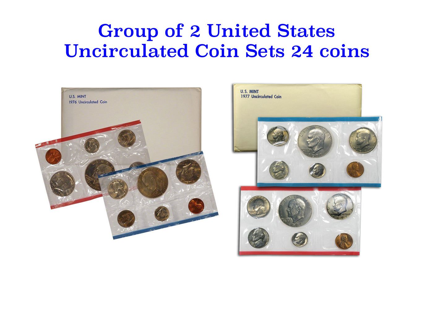 Group of 2 United States Mint Set in Original Government Packaging! From 1976-1977 with 24 Coins Inside!. Group of 2 United State Mint Set from 1976-1977 included a total of 24 coins. The 1975 Mint Set remains a unique issue during the course of the annual set offering from the United States Mint. It is the only Mint Set that includes coins bearing a date different than the date of the set. This is due to the fact that 1975-dated quarters, half dollars, and dollar coins were not produced. To celebrate America’s upcoming Bicentennial, these denominations would be issued with a new reverse design and the dual date “1776-1976”. In anticipation of high demand for the coins, production began in 1975. Accordingly, the bicentennial coins were included in the 1975 Uncirculated Mint Set. Another unique aspect of this set is that it only includes coins from the Philadelphia and Denver Mints. Starting this year, the San Francisco Mint no longer produced coins for circulation bearing the “S” mint mark. The Mint set contain two 1975 Lincoln Cents (P, D), two 1975 Jefferson Nickels (P, D) two 1976 Bicentennial Washington Quarters (P, D), two 1976 Bicentennial Kennedy Half Dollars (P, D), and two 1976 Bicentennial Eisenhower Dollars (P,D) that are Type 1 version. This variety exhibits thicker style lettering on the reverse design. The standard issue 1976 Mint Set included a total of twelve coins produced at the Philadelphia and Denver Mints. This was the Bicentennial year for America, which was marked by the issue of three denominations bearing special reverse designs. The 1976 Washington Quarter had a reverse design which depicted a Drummer Boy from the Revolutionary era. The 1976 Kennedy Half Dollar featured Independence Hall on the reverse. Lastly, the 1976 Eisenhower Dollar featured the Liberty Bell superimposed over an image of the moon. The obverse of each coin included the dual date “1776-1976”. The regular 1976 Uncirculated Mint Set included one example from the Philadelphia Mint and one example from the Denver Mint for each of these coins. Notably, the 1976 dollar coins are the type 2 variety, which can be differentiated by thinner lettering on the reverse. Other coins included in the Mint Set are the 1976 P&D Lincoln Cent, 1976 P&D Jefferson Nickel, and 1976 P&D Roosevelt Dime. Pricing for the twelve coin sets remained the same $6.00 price as the previous year. The coins were packaged in two individual cellophane packs, each containing the coins from one of the mint facilities. These were placed with two protective cardboards in a white envelope with printing “U.S. Mint” and “1976 Uncirculated Coin”.