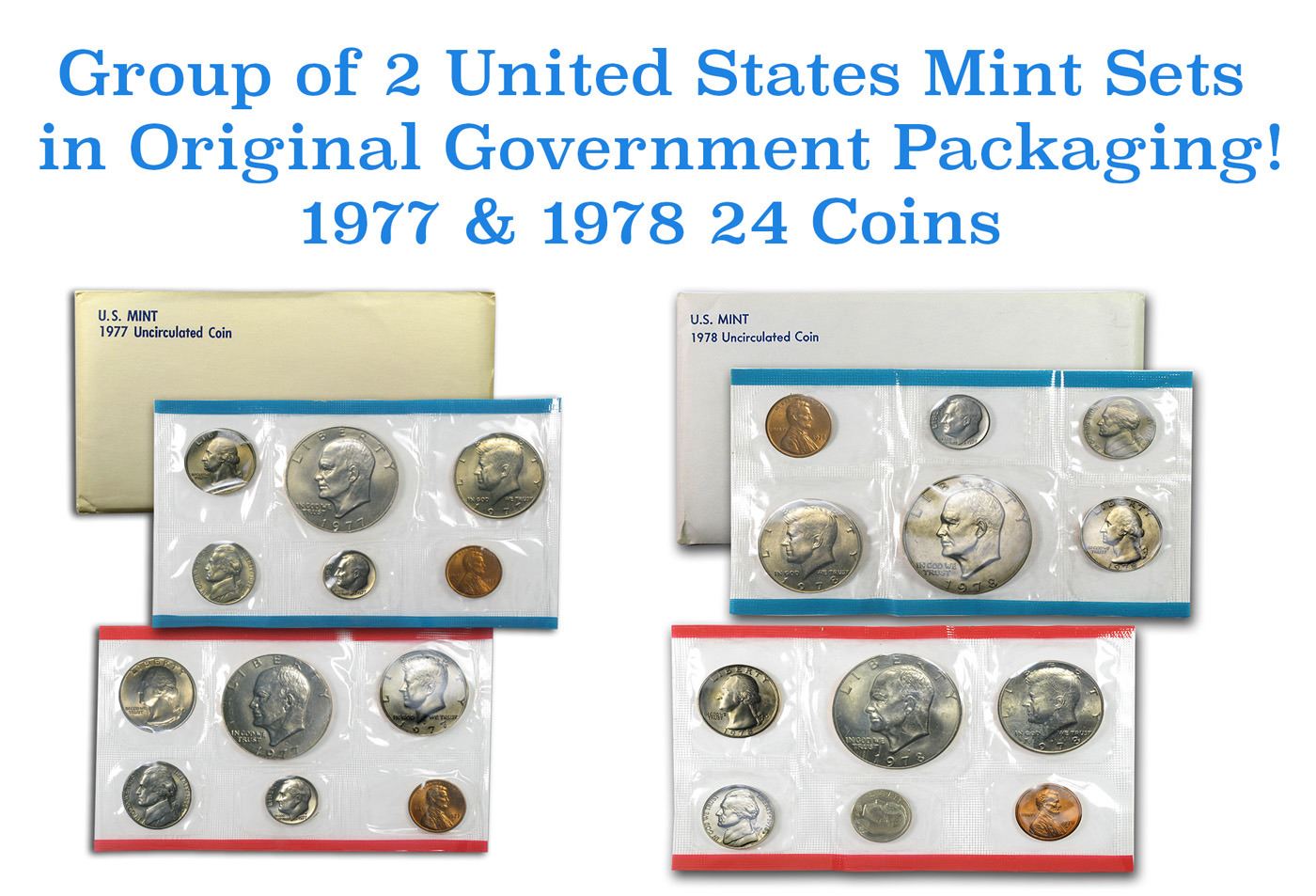 Group of 2 United States Mint Set in Original Government Packaging! From 1977-1978 with 24 Coins Inside!. Group of 2 United State Mint Set from 1977-1978 included a total of 24 coins. Each 1977 Mint Set total 12 coins, included the 1977 P&D Lincoln Cents, Jefferson Nickels, Roosevelt Dimes, Washington Quarters, Kennedy Half Dollars, and Eisenhower Dollars. These coins carried a combined face value of $3.82. All of the coins included in the set were also separately issued for circulation. Packaging for the annual set underwent a slight change. Primarily the envelope housing the set was slightly larger than the previous version, although the inner plastic cellophane packs retained the same size. The pack containing the Philadelphia Mint coins was bordered in blue, and the pack containing the Denver Mint coins was bordered in red. The white envelope indicated “U.S. Mint 1977 Uncirculated Coin”. The 1978 Mint Set contained a total of twelve coins struck at the Philadelphia and Denver Mint facilities. This set also marked the last year of the Eisenhower Dollar. Coins included in the set were arranged with the Philadelphia Mint coins in one plastic packet bordered in blue and the Denver mint coins in a separate packet bordered in red. The coin series represented were P&D Lincoln Cents, P&D Jefferson Nickels, P&D Roosevelt Dimes, P&D Kennedy Half dollars, and the aforementioned P&D Eisenhower Dollars.
