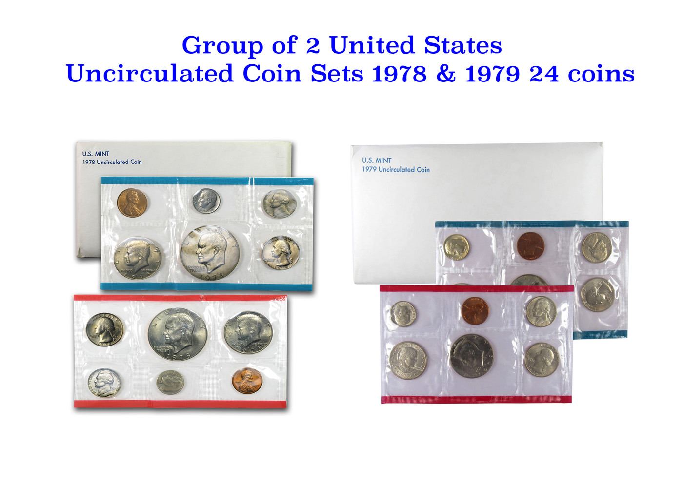 Group of 2 United States Mint Set in Original Government Packaging! From 1978-1979 with 24 Coins Inside!. Group of 2 United State Mint Set from 1976-1977 included a total of 24 coins. The 1978 Mint Set contained a total of twelve coins struck at the Philadelphia and Denver Mint facilities. This set also marked the last year of the Eisenhower Dollar. Coins included in the set were arranged with the Philadelphia Mint coins in one plastic packet bordered in blue and the Denver mint coins in a separate packet bordered in red. The coin series represented were P&D Lincoln Cents, P&D Jefferson Nickels, P&D Roosevelt Dimes, P&D Kennedy Half dollars, and the aforementioned P&D Eisenhower Dollars. A new circulating coin series debuted within the 1979 Mint Set. The Susan B. Anthony Dollar issued for circulation for the first time this year and examples struck at the Philadelphia and Denver Mints were included in the annual uncirculated coin set. Although coins were also produced for circulation at San Francisco, this coin was not included within the set. Each 1979 Uncirculated Mint Set contained P&D examples of the Lincoln Cent, Jefferson Nickel, Roosevelt Dime, Washington Quarter, Kennedy Half Dollar, and Susan B. Anthony Dollar. The six coins from each mint facility were placed within sealed plastic cellophane packs. These were placed between two protective cardboard pieces and placed within an envelope marked “U.S. Mint 1979 Uncirculated Coin”.