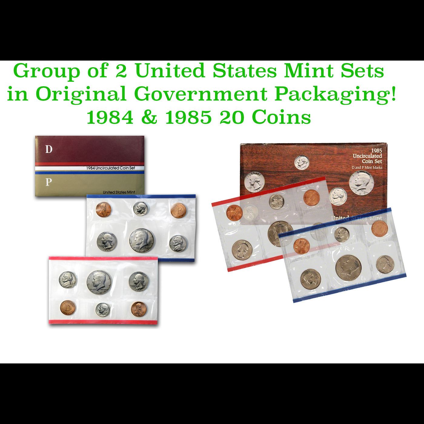 Group of 2 United States Mint Set in Original Government Packaging! From 1984-1985 with 20 Coins Inside!. Group of 2 United State Mint Set from 1984-1985 included a total of 20 coins. Starting 1984 the outer envelopes would feature colorful illustrations or images that would change each year of offering. This was a change from the plain white envelopes that had been used for the Mint Sets of the past two decades. Both set included the P&D Kennedy Half Dollars, P&D Washington Quarters, P&D Roosevelt Dimes, P&D Jefferson Nickels, and P&D Lincoln Cents. Completing the set were two mint tokens struck in copper plated bronze. These tokens contained the letter “P” and “D” to represent each mint facility. The 1984 Mint Set packaging had upper dark brown and lower light brown colors separated by red, white, and blue. The outside of the envelope had printing “1984 Uncirculated Coin Set”, “United States Mint”, and the mint marks “D” and “P”. The 1985 Mint Set envelope featured a wood grain background with images of each of the five denominations. Printing indicated “1985 Uncirculated Coin Set”, “D and P Mint Marks”, “United States Mint”.