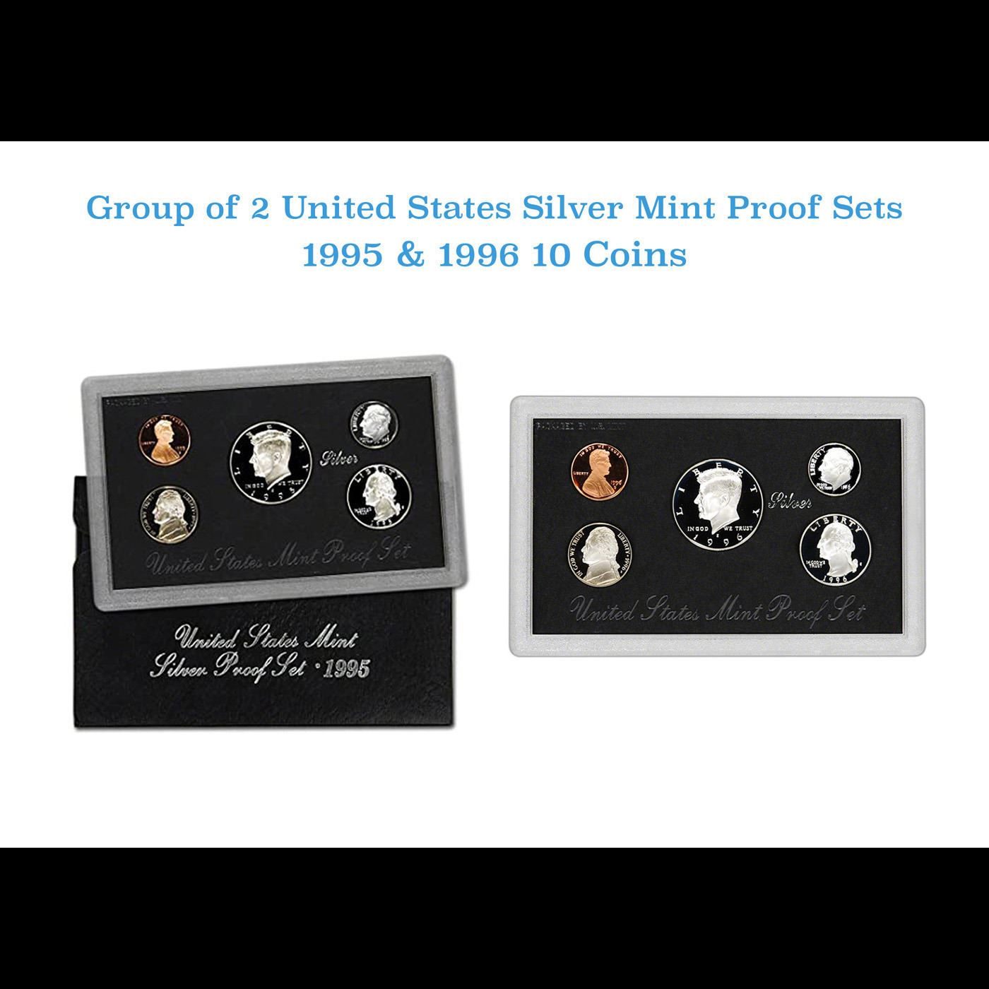 Group of 2 United States Mint Set in Original Government Packaging! From 1995-1996 with 21 Coins Inside! Includes 50th Anniversary 'W' mint Roosevelt Dime. Group of 2 United State Mint Set from 1995-1996 included a total of 21 coins. Each set comprised of Lincoln Cents (P, D), Jefferson Nickels (P, D), Roosevelt Dimes (P, D), Washington Quarters (P, D), Kennedy Half Dollar (P, D) plus two tokens bearing large letters “P” and “D” representing the Philadelphia and Denver Mints. The 1995 The five coins from the Philadelphia Mint and the related token were packaged in a cello wrapper bordered in blue. The Denver Mint coins and token were in a separate wrapper bordered in red. Along with a certificate of authenticity, the coins were placed within an illustrated envelope. The 1996 Mint Set was highlighted by the inclusion of a specially produced coin to mark the 50th anniversary of the Roosevelt Dime. As the coin was only available through the annual set. The 1996-W Roosevelt Dime was struck at the West Point Mint and carried the “W” mint mark. This extra coin was included in addition to the Kennedy Halves, Washington Quarters, Roosevelt Dimes, Jefferson Nickels, and Lincoln Cents struck at the Philadelphia and Denver Mints. The 1996-W dime was significant, because unlike the other coins it would not be issued for circulation. Packaging for the set highlighted the 50th anniversary of the Roosevelt Dime and the special 1996-W issue on the outer envelope, certificate of authenticity, and an additional insert. The ten regular coins and two mint tokens were sealed within cellophane packs in the usual format. The separate 1996-W Roosevelt Dime was placed within its own smaller individual pack. “The United States Mint Uncirculated Coin Set with D and P Mint Marks”. The US Treasury Department seal and images of the coins appear to the left.