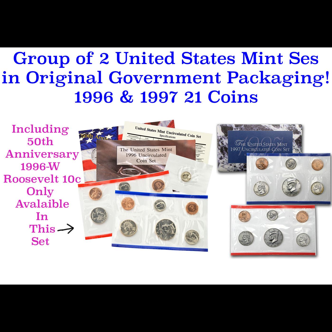 Group of 2 United States Mint Set in Original Government Packaging! From 1996-1997 with 21 Coins Inside!. Group of 2 United State Mint Set from 1996-1997 included a total of 21 coins. The 1996 Mint Set was highlighted by the inclusion of a specially produced coin to mark the 50th anniversary of the Roosevelt Dime. As the coin was only available through the annual set. The 1996-W Roosevelt Dime was struck at the West Point Mint and carried the “W” mint mark. This extra coin was included in addition to the Kennedy Halves, Washington Quarters, Roosevelt Dimes, Jefferson Nickels, and Lincoln Cents struck at the Philadelphia and Denver Mints. The 1996-W dime was significant, because unlike the other coins it would not be issued for circulation. Packaging for the set highlighted the 50th anniversary of the Roosevelt Dime and the special 1996-W issue on the outer envelope, certificate of authenticity, and an additional insert. The ten regular coins and two mint tokens were sealed within cellophane packs in the usual format. The separate 1996-W Roosevelt Dime was placed within its own smaller individual pack. Each 1997 Mint Set includes uncirculated examples of the Kennedy Half Dollar, Washington Quarter, Roosevelt Dime, Jefferson Nickel, and Lincoln Cent. A total of ten coins are included, comprised of one example each from the Philadelphia and Denver Mints. Additional tokens are included with large sized mint marks “P” and “D”. Packaging for the annual set was updated for the outer illustrated envelope. Against a marbled background was the title “The 1997 United States Uncirculated Coin Set”. Within the envelope were a certificate of authenticity signed by the Director of the Mint and two mylar packs containing the coins. The coins and token from the Philadelphia and Denver Mints were packaged separately.