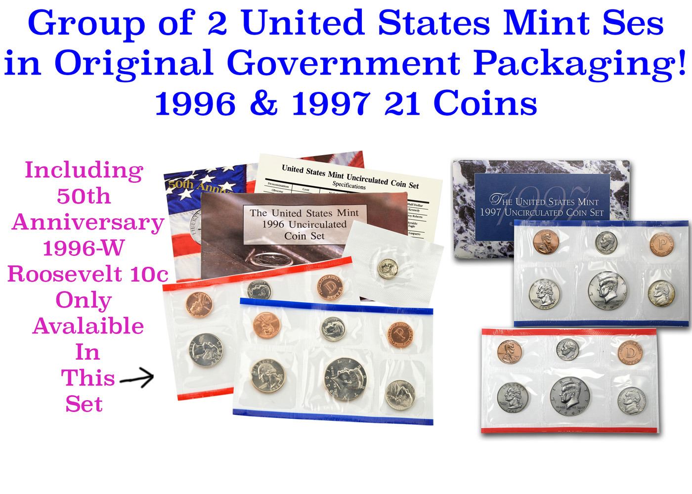 Group of 2 United States Mint Set in Original Government Packaging! From 1996-1997 with 21 Coins Inside!. Group of 2 United State Mint Set from 1996-1997 included a total of 21 coins. The 1996 Mint Set was highlighted by the inclusion of a specially produced coin to mark the 50th anniversary of the Roosevelt Dime. As the coin was only available through the annual set. The 1996-W Roosevelt Dime was struck at the West Point Mint and carried the “W” mint mark. This extra coin was included in addition to the Kennedy Halves, Washington Quarters, Roosevelt Dimes, Jefferson Nickels, and Lincoln Cents struck at the Philadelphia and Denver Mints. The 1996-W dime was significant, because unlike the other coins it would not be issued for circulation. Packaging for the set highlighted the 50th anniversary of the Roosevelt Dime and the special 1996-W issue on the outer envelope, certificate of authenticity, and an additional insert. The ten regular coins and two mint tokens were sealed within cellophane packs in the usual format. The separate 1996-W Roosevelt Dime was placed within its own smaller individual pack. Each 1997 Mint Set includes uncirculated examples of the Kennedy Half Dollar, Washington Quarter, Roosevelt Dime, Jefferson Nickel, and Lincoln Cent. A total of ten coins are included, comprised of one example each from the Philadelphia and Denver Mints. Additional tokens are included with large sized mint marks “P” and “D”. Packaging for the annual set was updated for the outer illustrated envelope. Against a marbled background was the title “The 1997 United States Uncirculated Coin Set”. Within the envelope were a certificate of authenticity signed by the Director of the Mint and two mylar packs containing the coins. The coins and token from the Philadelphia and Denver Mints were packaged separately.