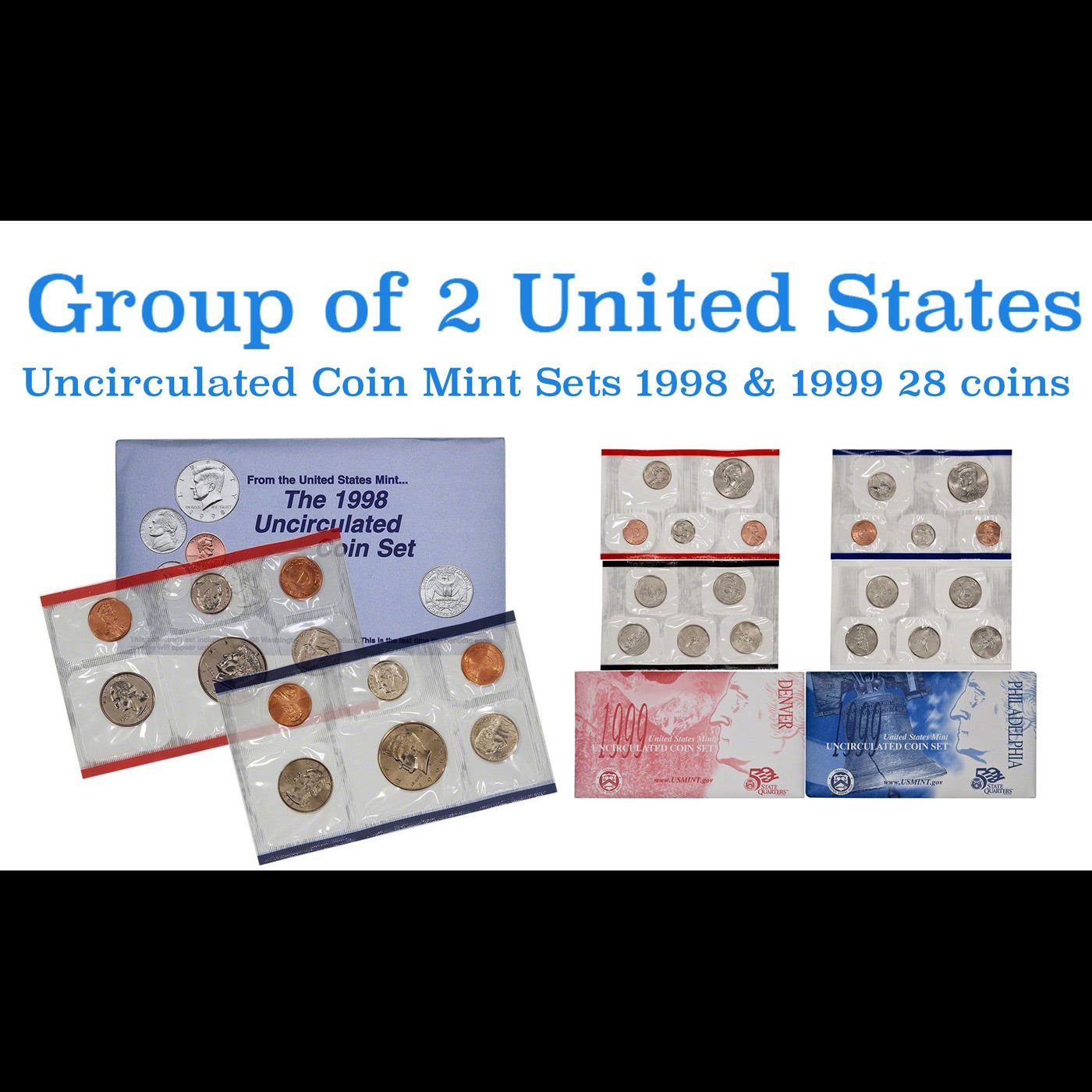 Group of 2 United States Mint Set in Original Government Packaging! From 1998-1999 with 30 Coins Inside!. Group of 2 United State Mint Set from 1998-1999 included a total of 30 coins. In many ways, the 1998 Mint Set represented the end of an era. The 1998 Mint Set contained the final Washington Quarters before the obverse design would be modified and the reverse would feature five different annual designs commemorating the states. The other coins included were the Kennedy Half Dollar, Roosevelt Dime, Jefferson Nickel, and Lincoln Cent. The ten coins were packaged in two separate mylar packs with tokens representing the Philadelphia and Denver Mints. The outer envelope depicted the circulating coins against a blue background and specifically displayed the reveres design of the quarter. The envelope carried the title “From the United States Mint… The 1998 Uncirculated Coin Set”. An additional message was included at the bottom of the envelope: “This collector’s set includes two 1998 Washington Quarter Dollars. This is the last time the heraldic eagle reverse will appear until at least 2009.” The 1999 Mint Set saw the number of coins increased to 18, and separate envelopes would be provided for the Philadelphia and Denver Mint coins to accommodate the larger format. The expansion of the set was the result of the launch of the 50 State Quarters Program. The quarter dollar would feature five different reverse designs per year, featuring the states in the order they joined the union. Each 1999 Mint Set contained the first five quarter designs featuring Delaware, Pennsylvania, New Jersey, Georgia, and Connecticut. The additional coins included the 1999 Lincoln Cents, Jefferson Nickels, Roosevelt Dimes, and Kennedy Half Dollars. For each coin, there was one example each from the Philadelphia and Denver Mint facilities. Packaging consisted of two separate envelopes themed in blue and red. The blue envelope contained the nine coins produced at the Philadelphia Mint, while the red envelope contained the coins of the Denver Mint. A complete set as issued consists of both envelopes and all of the coins pictured above.