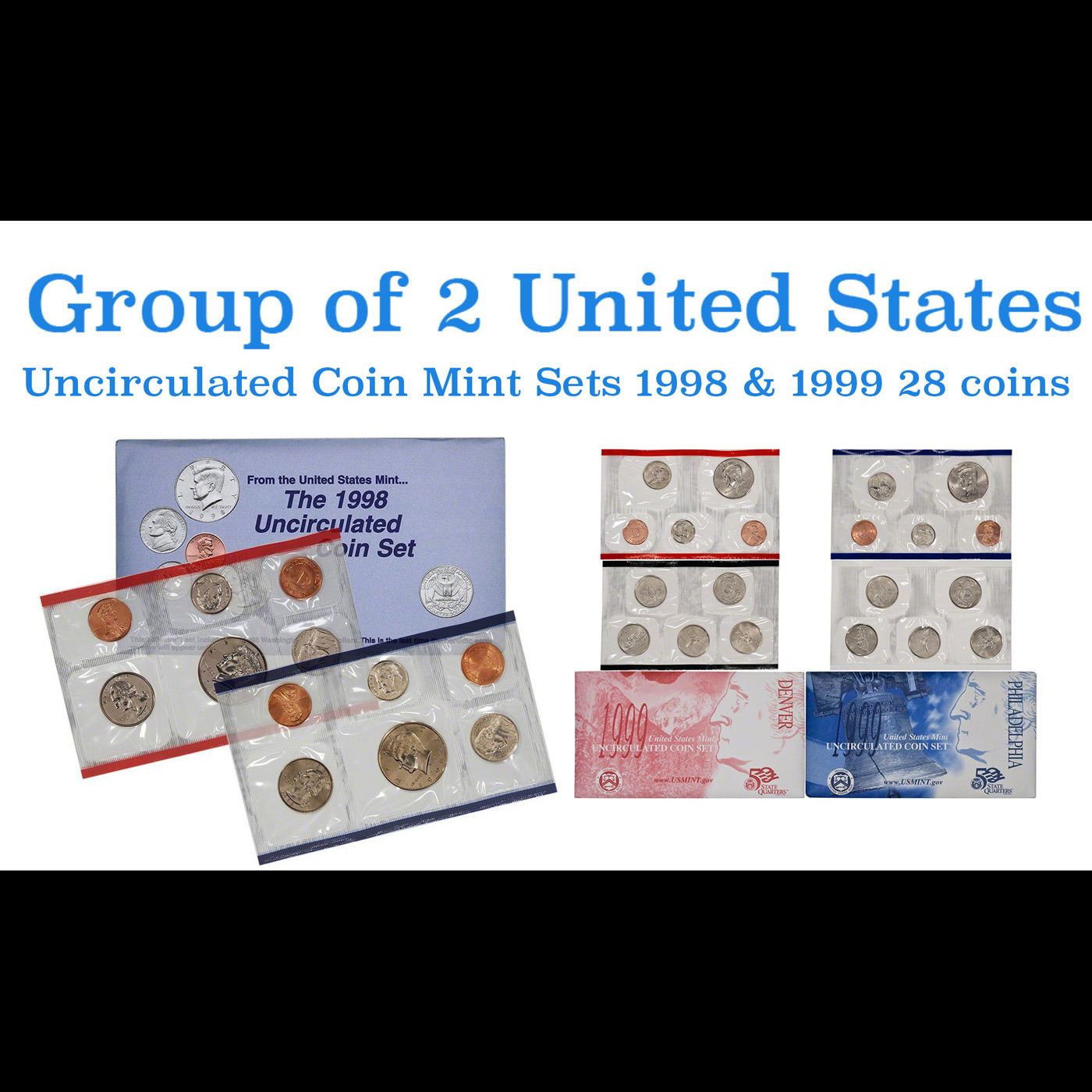Group of 2 United States Mint Set in Original Government Packaging! From 1998-1999 with 30 Coins Inside!. Group of 2 United State Mint Set from 1998-1999 included a total of 30 coins. In many ways, the 1998 Mint Set represented the end of an era. The 1998 Mint Set contained the final Washington Quarters before the obverse design would be modified and the reverse would feature five different annual designs commemorating the states. The other coins included were the Kennedy Half Dollar, Roosevelt Dime, Jefferson Nickel, and Lincoln Cent. The ten coins were packaged in two separate mylar packs with tokens representing the Philadelphia and Denver Mints. The outer envelope depicted the circulating coins against a blue background and specifically displayed the reveres design of the quarter. The envelope carried the title “From the United States Mint… The 1998 Uncirculated Coin Set”. An additional message was included at the bottom of the envelope: “This collector’s set includes two 1998 Washington Quarter Dollars. This is the last time the heraldic eagle reverse will appear until at least 2009.” The 1999 Mint Set saw the number of coins increased to 18, and separate envelopes would be provided for the Philadelphia and Denver Mint coins to accommodate the larger format. The expansion of the set was the result of the launch of the 50 State Quarters Program. The quarter dollar would feature five different reverse designs per year, featuring the states in the order they joined the union. Each 1999 Mint Set contained the first five quarter designs featuring Delaware, Pennsylvania, New Jersey, Georgia, and Connecticut. The additional coins included the 1999 Lincoln Cents, Jefferson Nickels, Roosevelt Dimes, and Kennedy Half Dollars. For each coin, there was one example each from the Philadelphia and Denver Mint facilities. Packaging consisted of two separate envelopes themed in blue and red. The blue envelope contained the nine coins produced at the Philadelphia Mint, while the red envelope contained the coins of the Denver Mint. A complete set as issued consists of both envelopes and all of the coins pictured above.