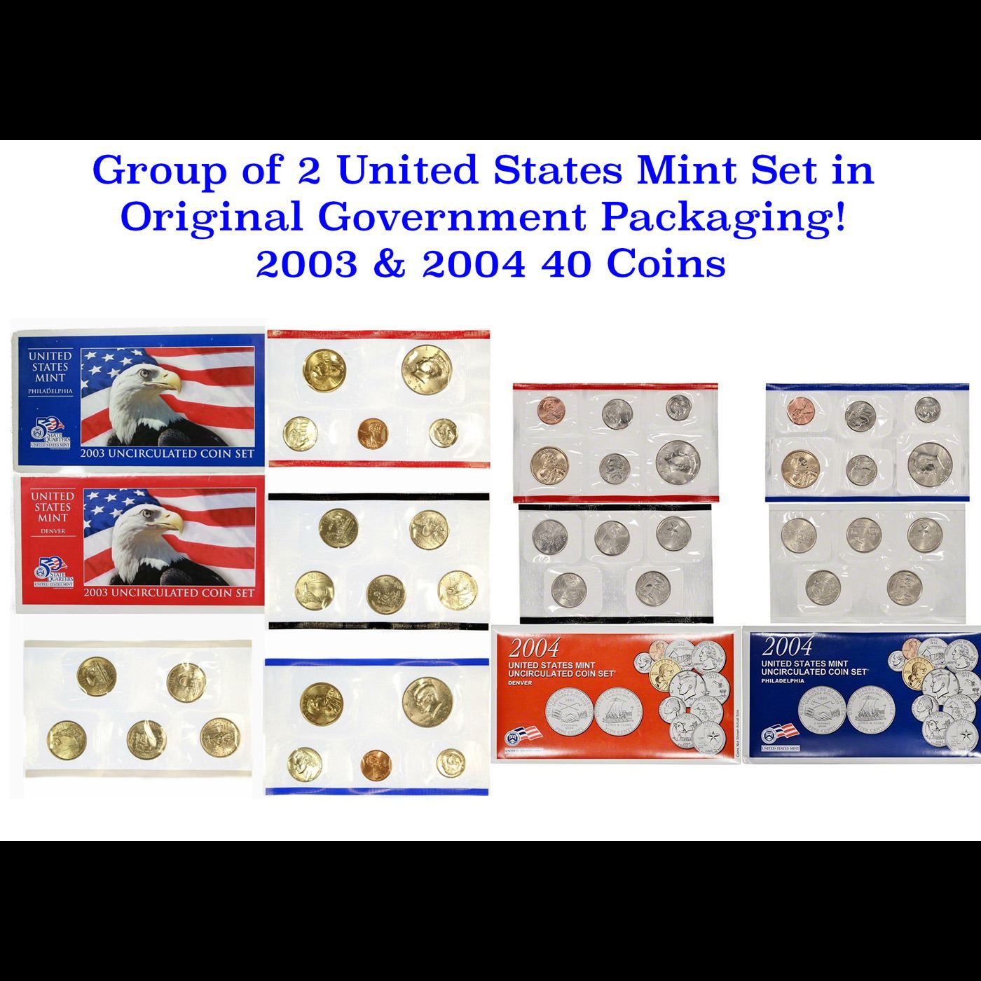 Group of 2 United States Mint Set in Original Government Packaging! From 2003-2004 with 42 Coins Inside!. Each set included Philadelphia and Denver Mint examples of each coin. Included in each set was the Lincoln Cent, Jefferson Nickel, Roosevelt Dime, Kennedy Half Dollar and a Sacagawea Dollar. But for 204 number of coins per set rose from 20 to 22 pieces. This year two different designs were issued for the five cent piece, as part of the Westward Journey Nickel series to commemorate the Louisiana Purchase and the exploration of the western territories by explorers Meriwether Lewis and William Clark. The obverse of the 2004 nickels remained the same portrait of Jefferson, while the reverse carried a depiction of the keelboat used in the expedition and a peace medal given to local inhabitants in the territories. State Quarters featuring Illinois, Alabama, Maine, Missouri, Arkansas, Michigan, Florida, Texas, Iowa, and Wisconsin. At this point in time, the two largest denominations ( $1 & 50c) were not issued for circulation, but only included in collector and numismatic products. Packaging for the 2003 Mint Set included outer envelopes depicting a bald eagle against an American flag. Separate red and blue envelopes were created for the Denver and Philadelphia Mint Cons. Within the envelopes coins from each mint were packaged in two separate packs, one containing the State Quarters and the other containing the remaining denominations. A certificate of authenticity signed by the US Mint Director was also placed within one of the envelopes. Packaging for 2004 set highlighted the new nickel designs, putting large sized images of the coins at the center of each envelope. The other coins were depicted in smaller scale to the side of the envelope.