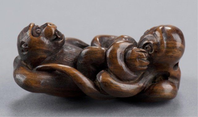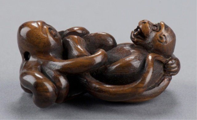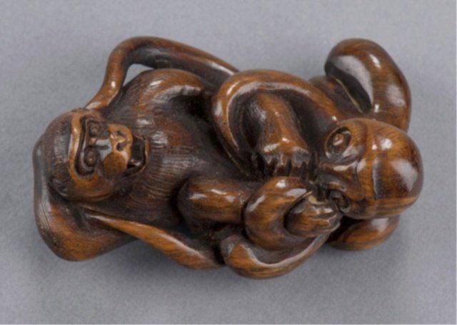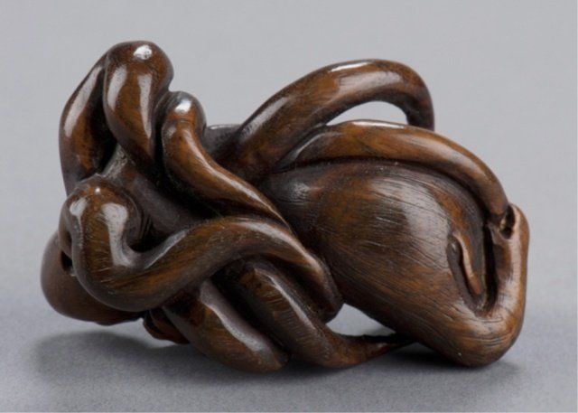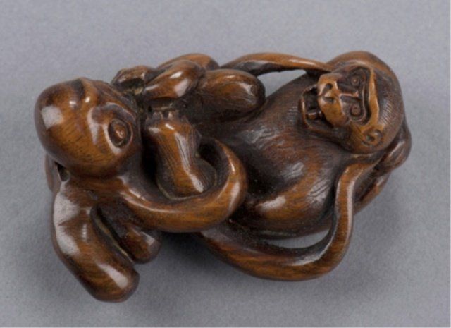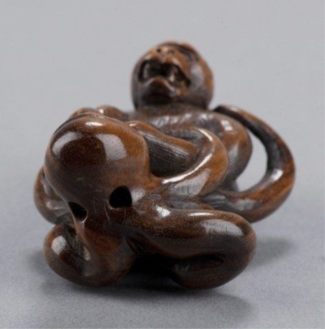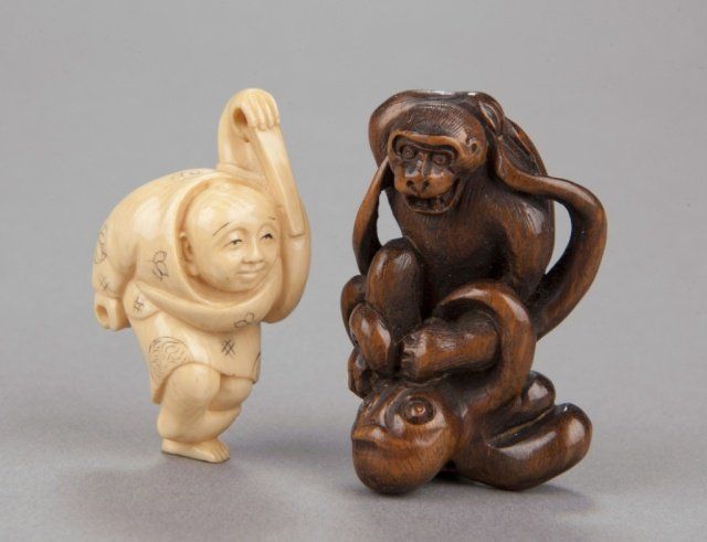 The first, by Gyokusho, mid 20th century, ivory crane dancer. Signed, Gyokusho. 2 1/8in (5.3cm). The second, mid 19th century, wood of an octopus and monkey intertwined in a mortal struggle. Signed on the underside, has not been read. 2 1/8in (5.4cm).