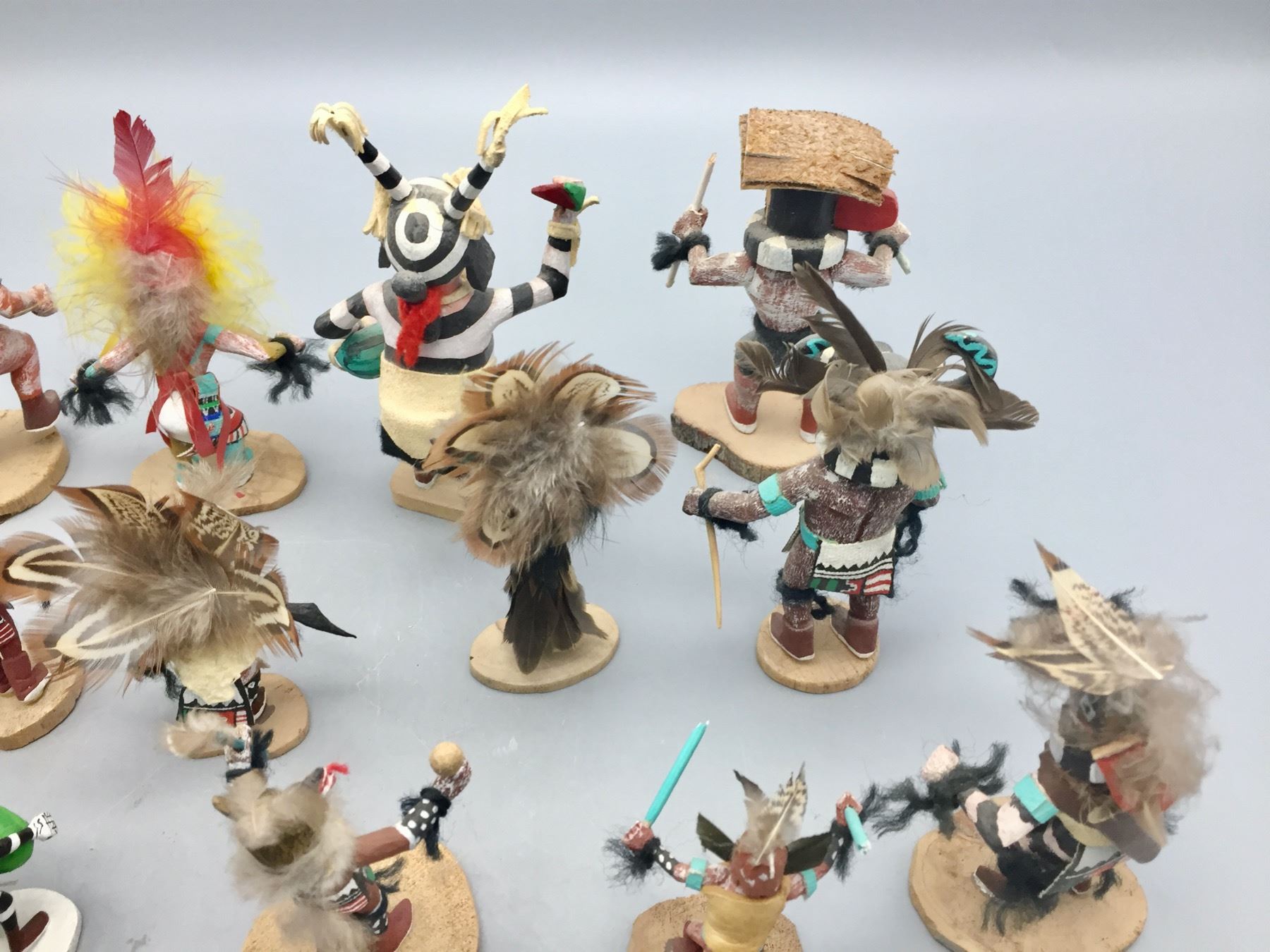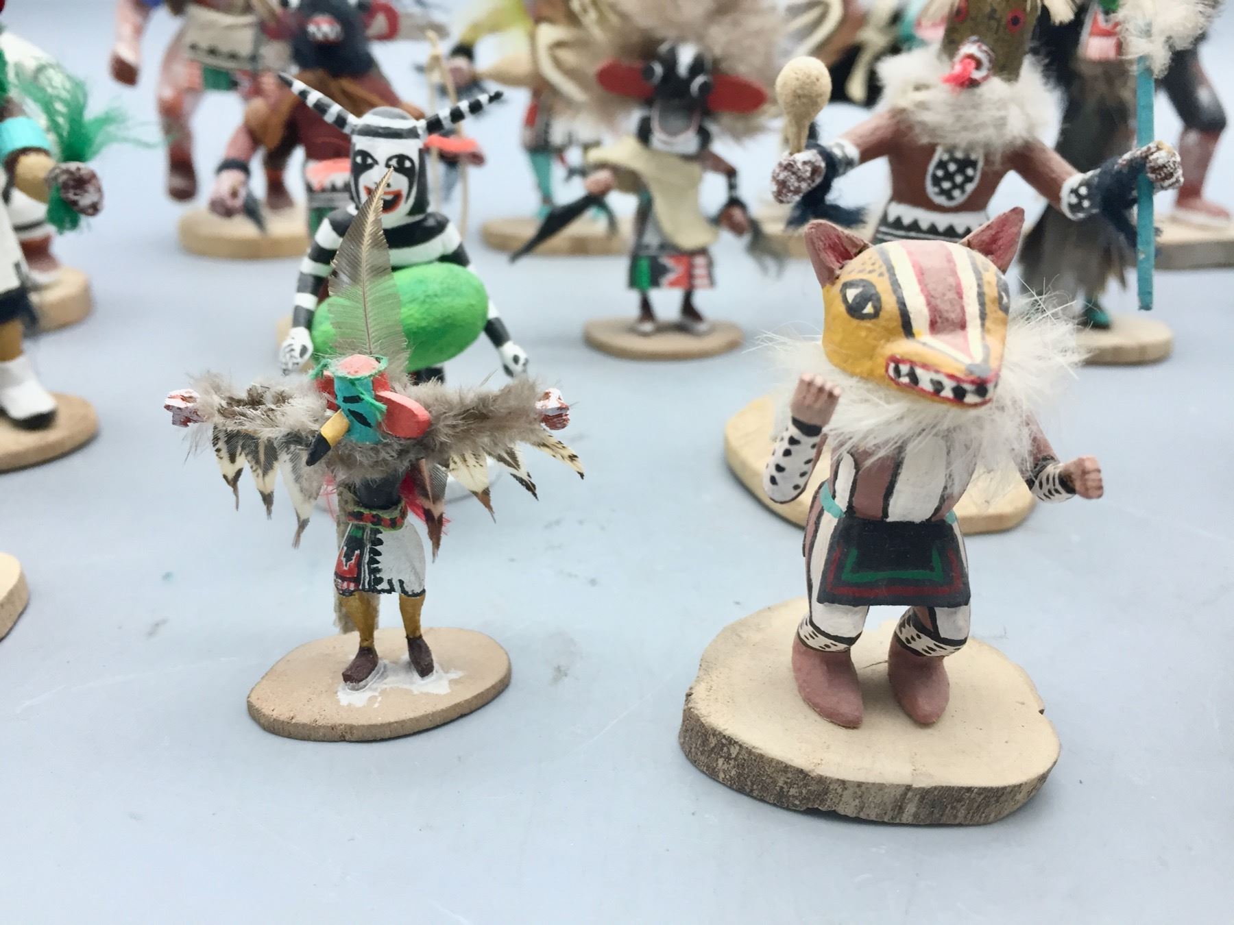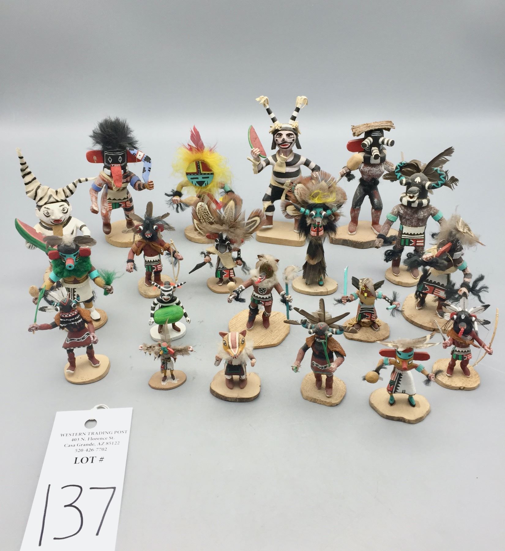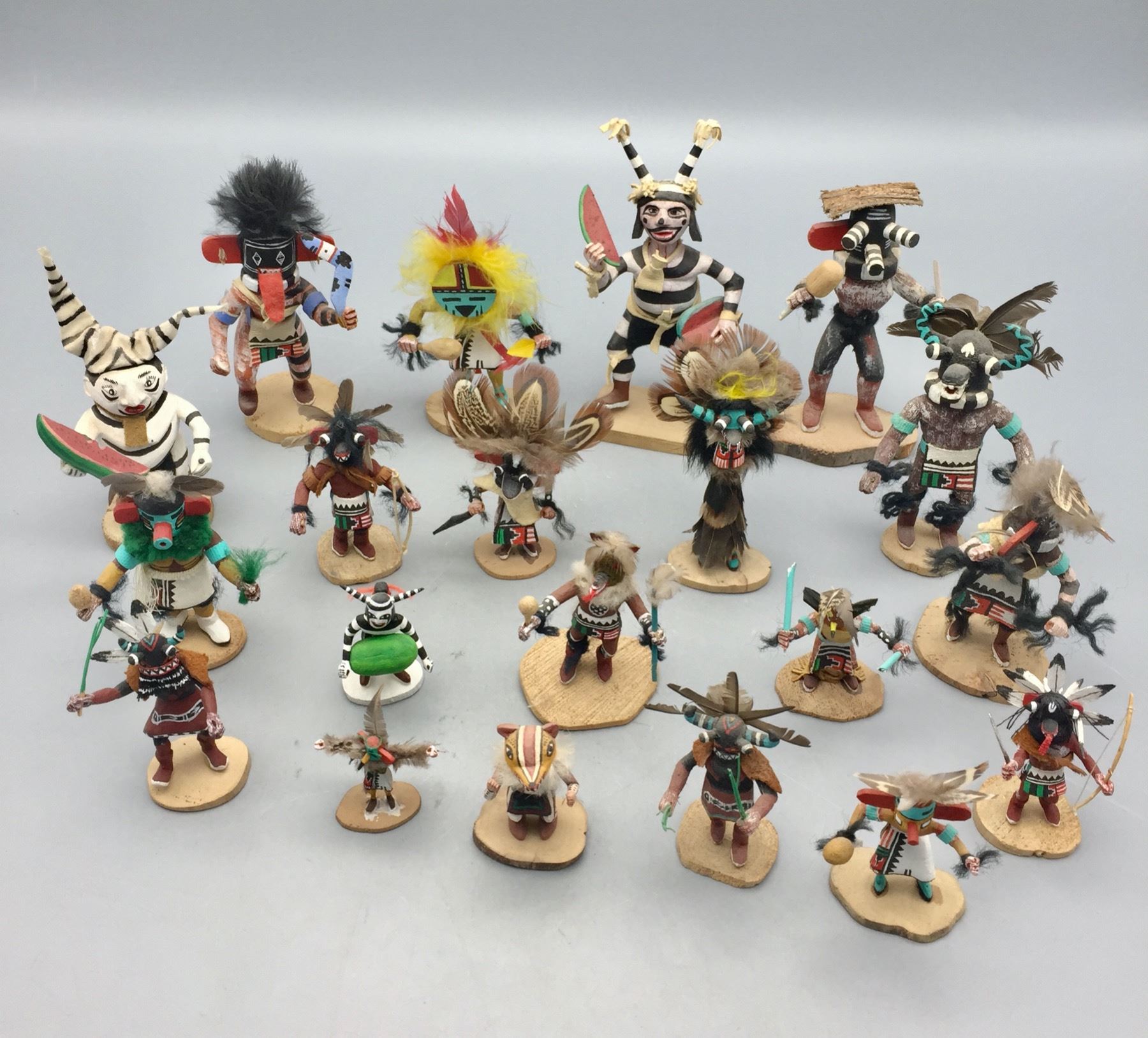 Description: Presented for sale in this lot we have a group of 20 handmade Kachinas in various styles and sizes. Take a look! Maker: Various. Approx. Age: Vintage to modern. Size: Various. Condition: Pretty good for their ages, some wear and imperfections expected. Please look closely at the pictures - they are an important part of our description. Shipping: There will be a $15 handling, packaging fee for shipping this lot. The actual cost of postage will be added on top of that.