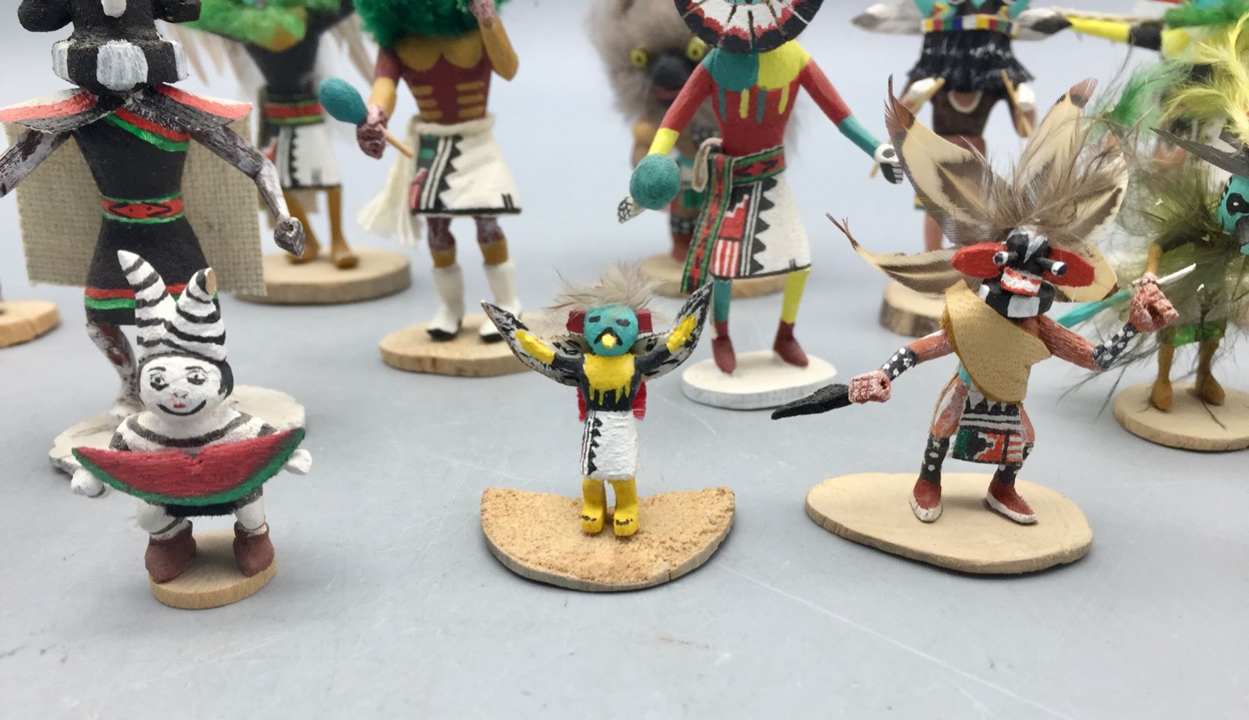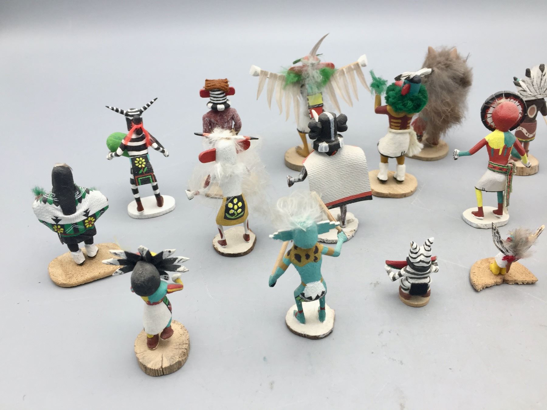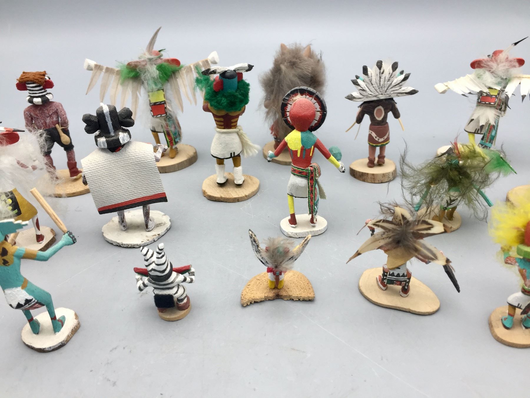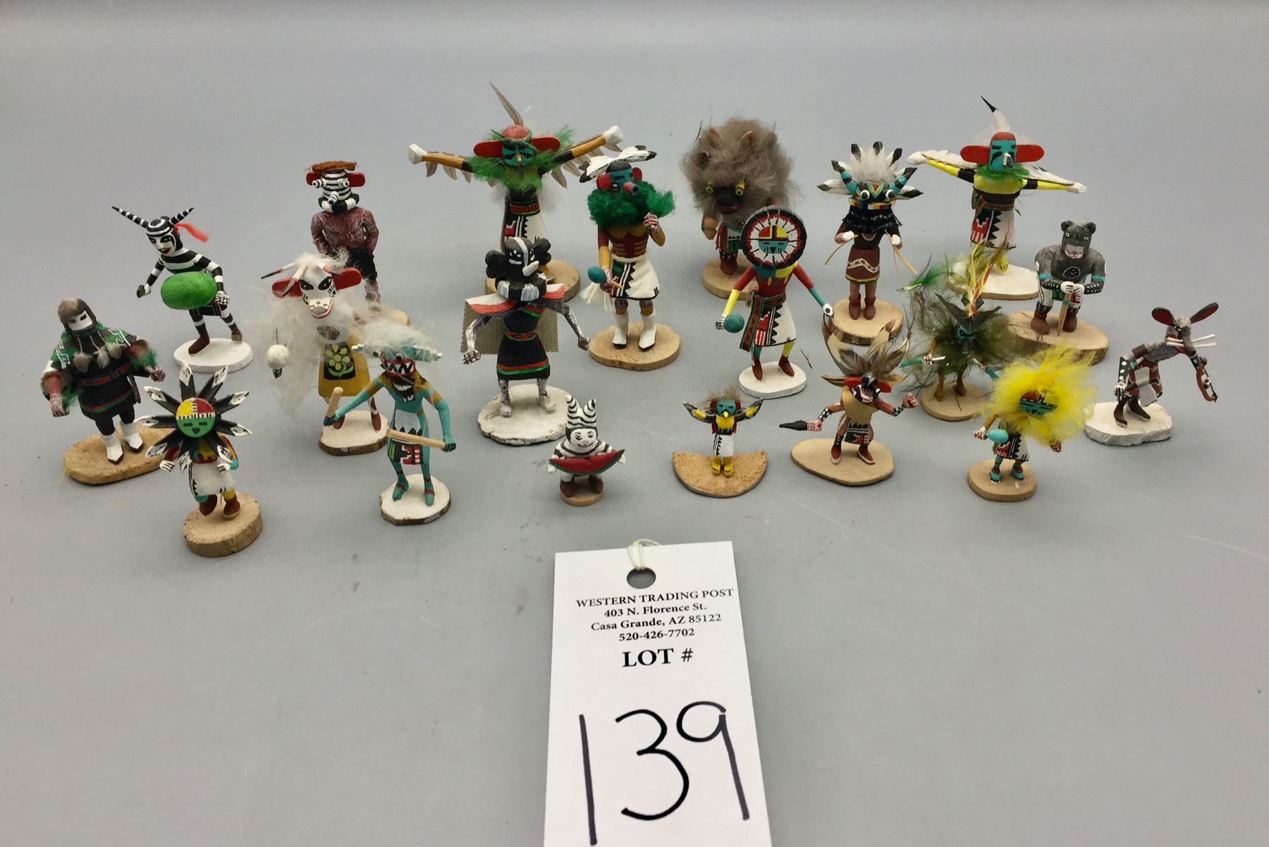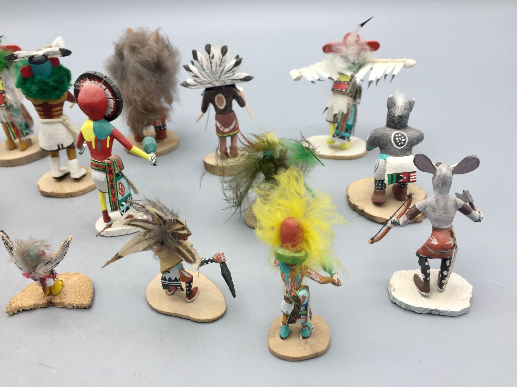 Description: Presented for sale in this lot we have a group of 20 handmade Kachinas in various styles and sizes. Take a look! Maker: Various. Approx. Age: Vintage to modern. Size: Various. Condition: Pretty good for their ages, some wear and imperfections expected. Please look closely at the pictures - they are an important part of our description. Shipping: There will be a $15 handling, packaging fee for shipping this lot. The actual cost of postage will be added on top of that.