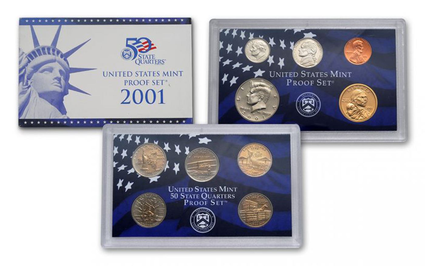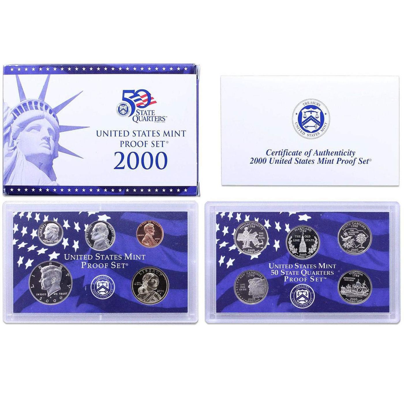 Group of 3, 1999-2001 Mint Proof Set In Original Case, 29 coins. Group of 3 1999-2001 for 29 coins. The 1999 set contains the five State Quarters honoring Delaware, Pennsylvania, New Jersey, Georgia, and Connecticut. Completing the set were the 1999-dated Lincoln Cent, Jefferson Nickel, Roosevelt Dime, and Kennedy Half Dollar for a total of nines coins. 2000 & 2001 added Massachusetts, Maryland, South Carolina, New Hampshire, Virginia, New York, North Carolina, Rhode Island, Vermont, and Kentucky. Along with New Saxagawea dollar. All coins were struck at the San Francisco Mint and carry the “S” mint mark. The cent, nickel, dime, and half dollar were sealed in a single lens with a decorative blue insert. The five State Quarters were sealed in a separate plastic lens. The two lenses were packaged with a certificate of authenticity in a cardboard box with the Statue of Liberty featured prominently.