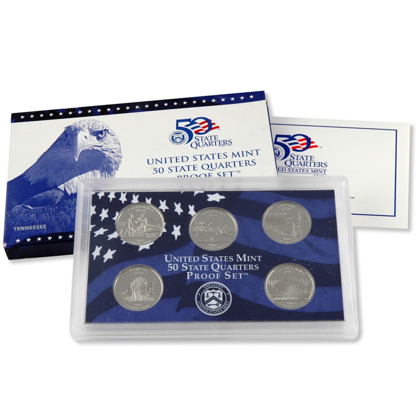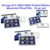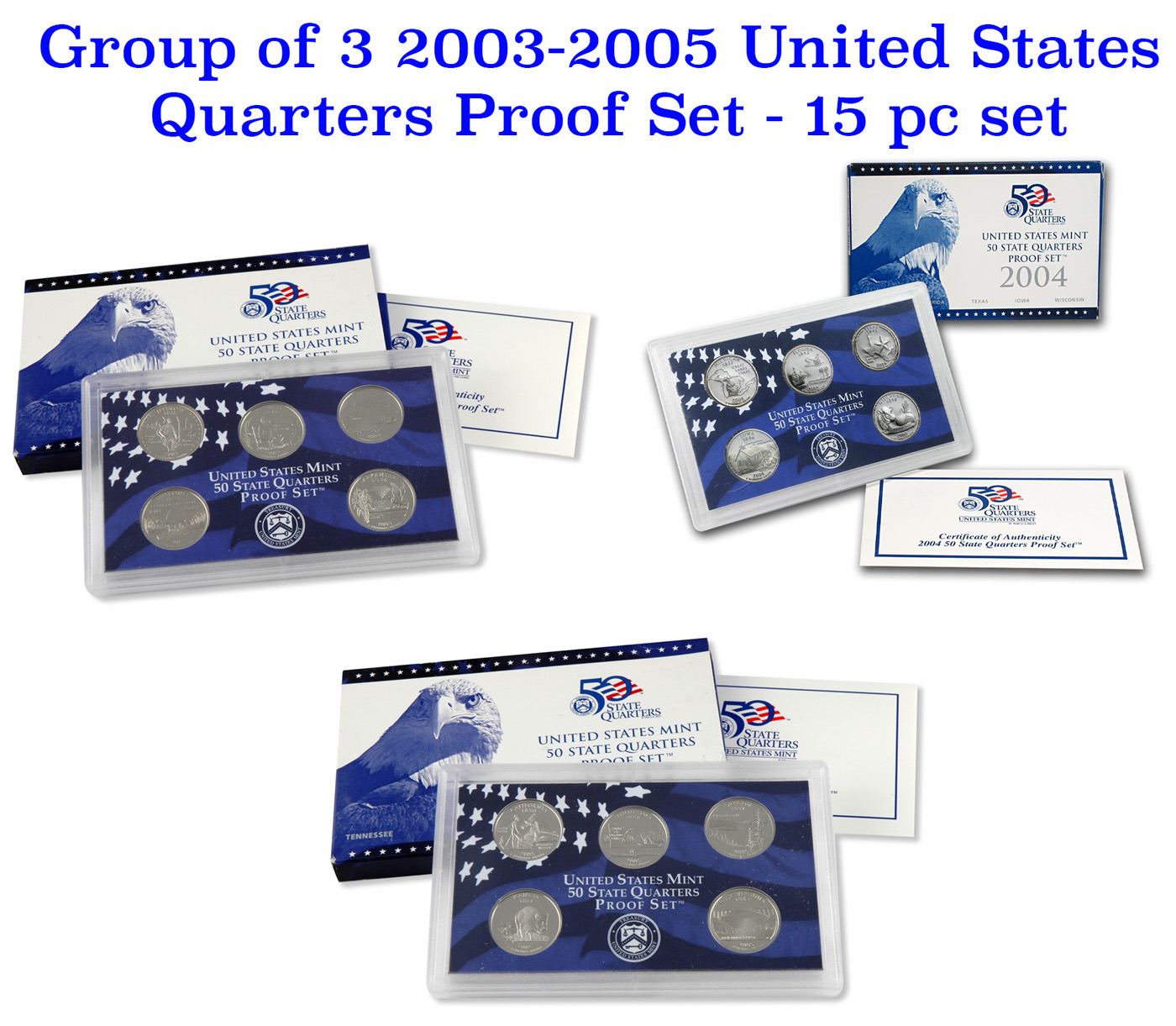 Group of 3 2003-2005 United States Quarters Proof Set - 15 pc set. 2003-2005 United States Quarters Proof Set - 15 pc set Low mintage. Each Set contains 5 Proof State Quarters. They are Illinois, Missouri, Alabama, Arkansas, Maine, Michigan, Florida, Texas, Iowa, Wisconsin, California, Minnesota, Oregon, Kansas and West Virginia. Total of 15 pieces; Complete with Original Packaging and COA.