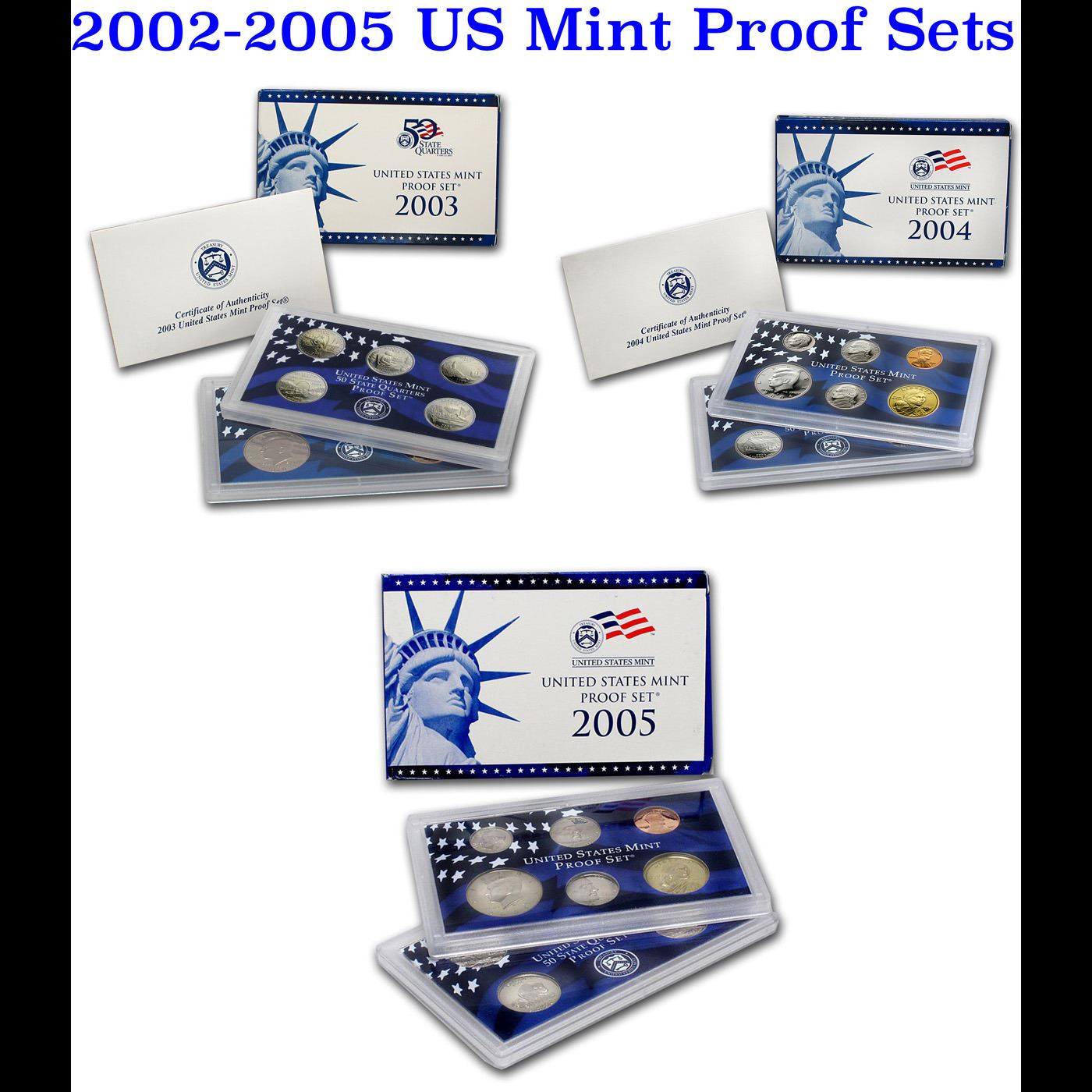 Group of 3 2003-2005 United States Quarters Proof Set - 15 pc set. 2003-2005 United States Quarters Proof Set - 15 pc set Low mintage. Each Set contains 5 Proof State Quarters. They are Illinois, Missouri, Alabama, Arkansas, Maine, Michigan, Florida, Texas, Iowa, Wisconsin, California, Minnesota, Oregon, Kansas and West Virginia. Total of 15 pieces; Complete with Original Packaging and COA.