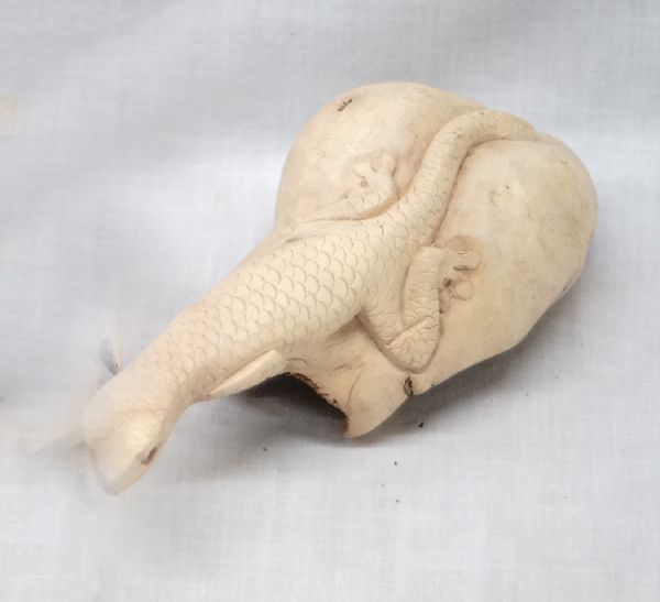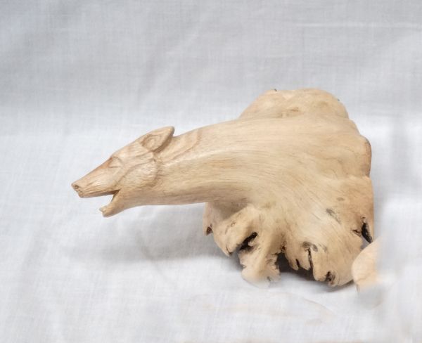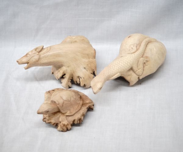 Group of 3 Balinese Chinaberry Hand Carved Burls, featured are a turtle, howling wolf, and gecko, sizes range from 4'' to 6''L, from Bali, Indonesia, fabulous details