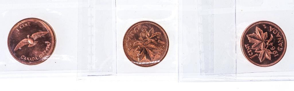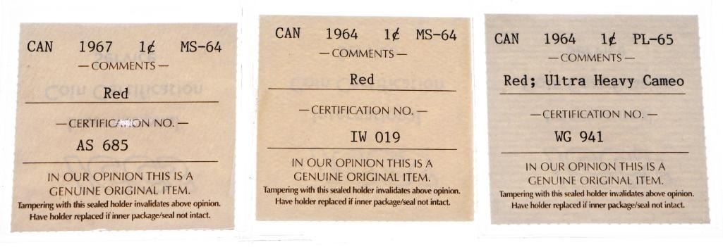 Group of 3 Canada One Cent Coins - 1964 MS64, 1964 PL65, 1967 MS 64 - All ICCS