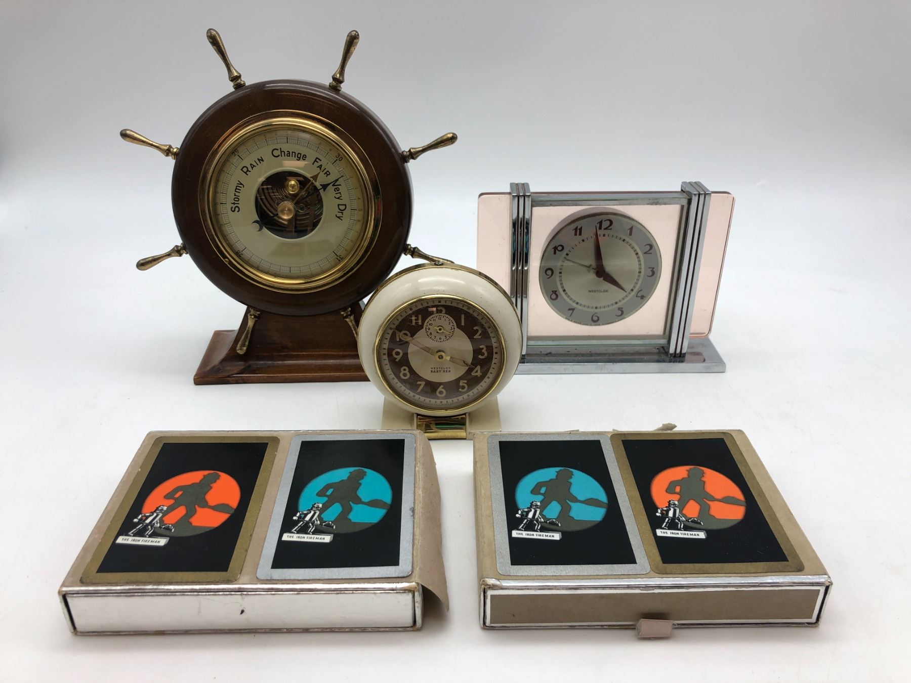 Group of 3 Clocks & 2 set of Congress Quality playing cards - includes West Clox Baby Ben/Ship Wheel Clock - made in West Germany & West Clox