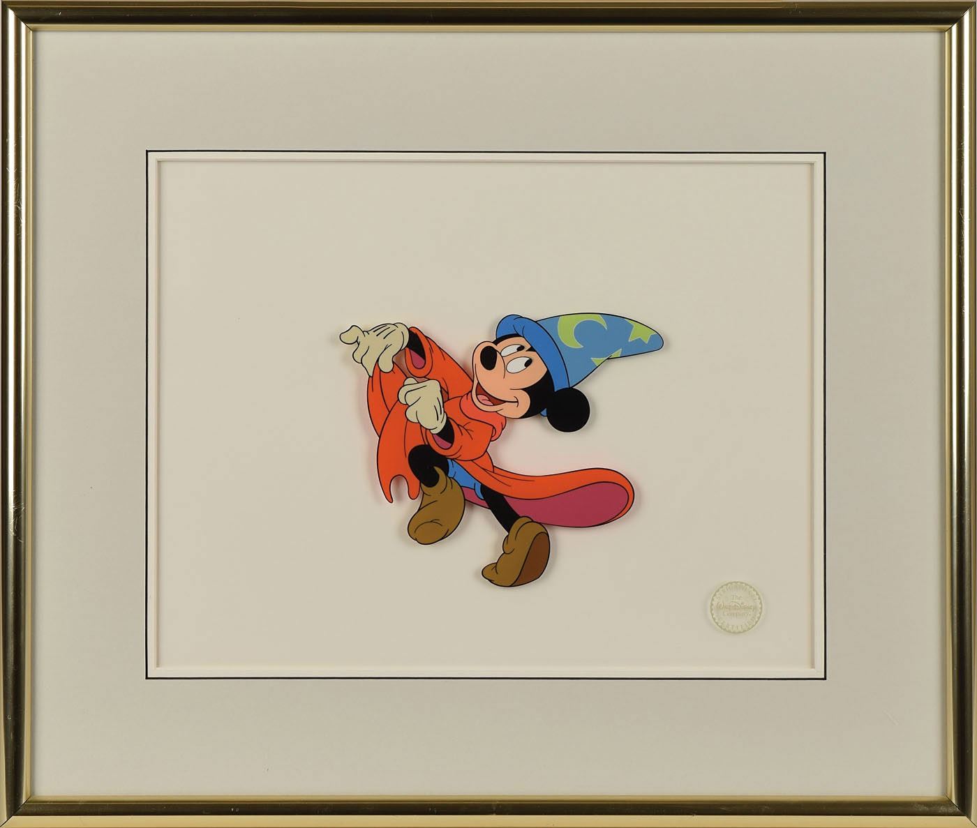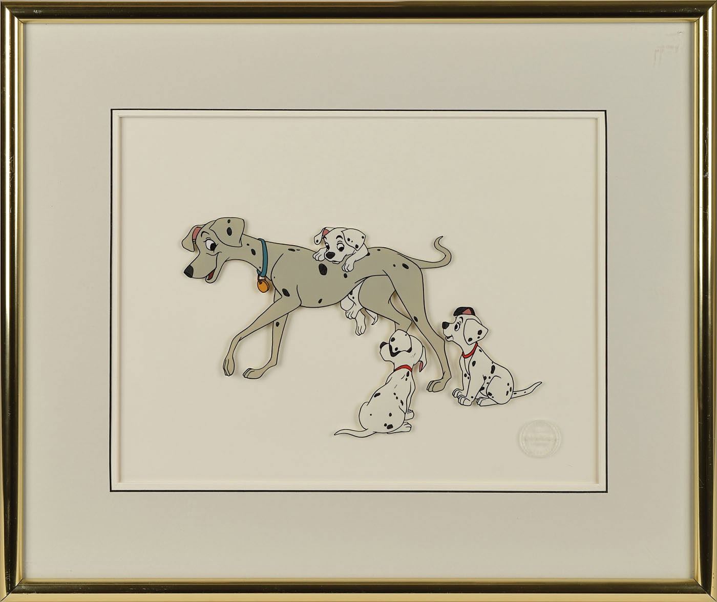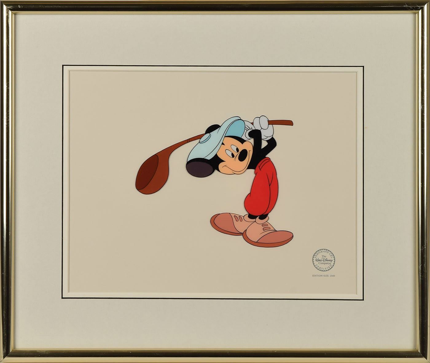 Group of three limited edition 13 x 10 Walt Disney Company sericels, individually matted and framed to 19.25 x 16.25. Includes: Mickey Mouse as the Sorcerer's Apprentice from Fantasia (limited to 1000); Mickey Mouse golfing from Canine Caddy (limited to 2500); and Perdita and puppies from 101 Dalmatians (limited to 1000). In overall fine condition.