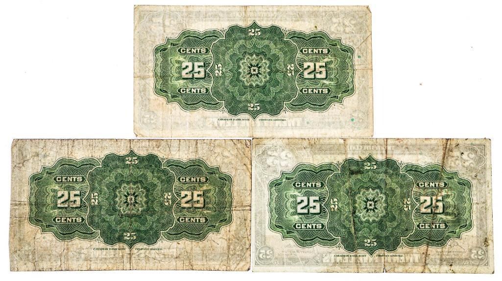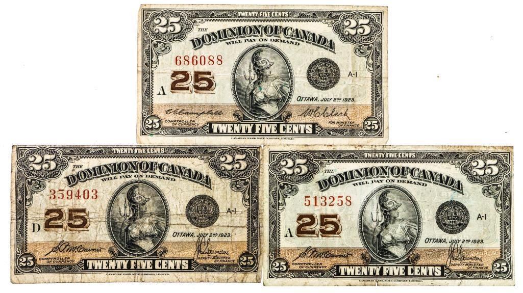 Group of 3 Dominion of Canada 1923 25 Cent Notes - 2 Signature Sets-79562