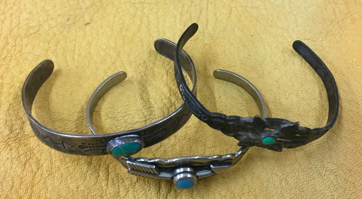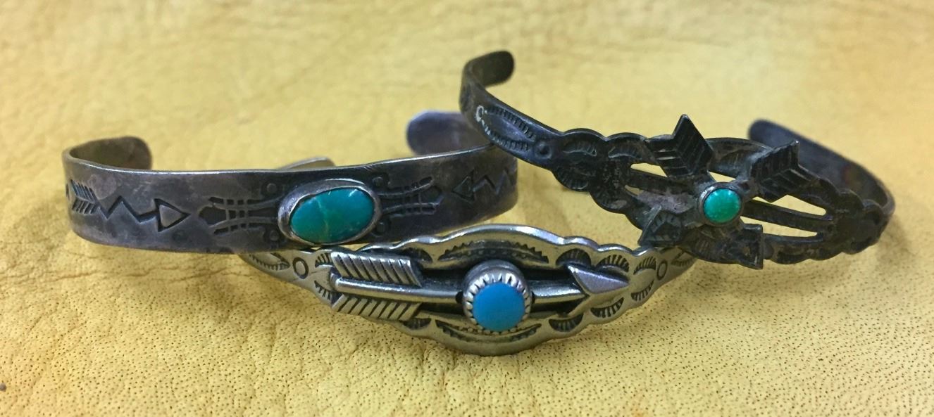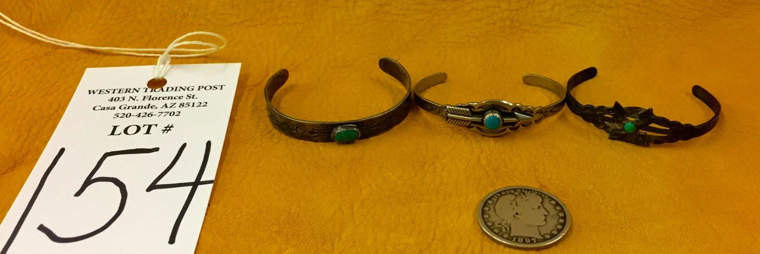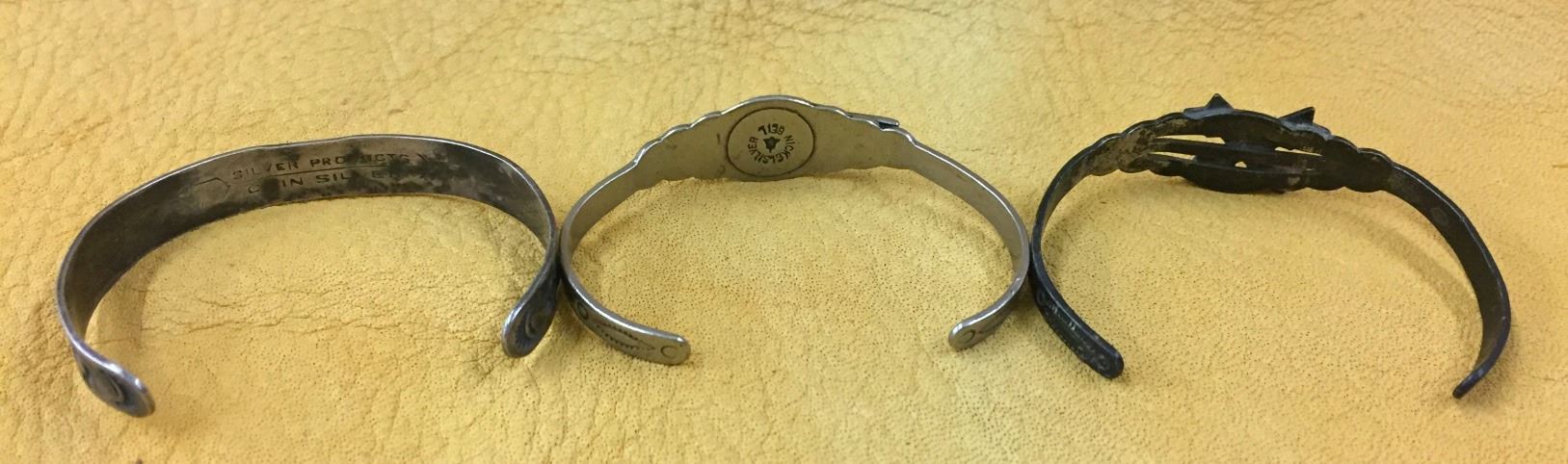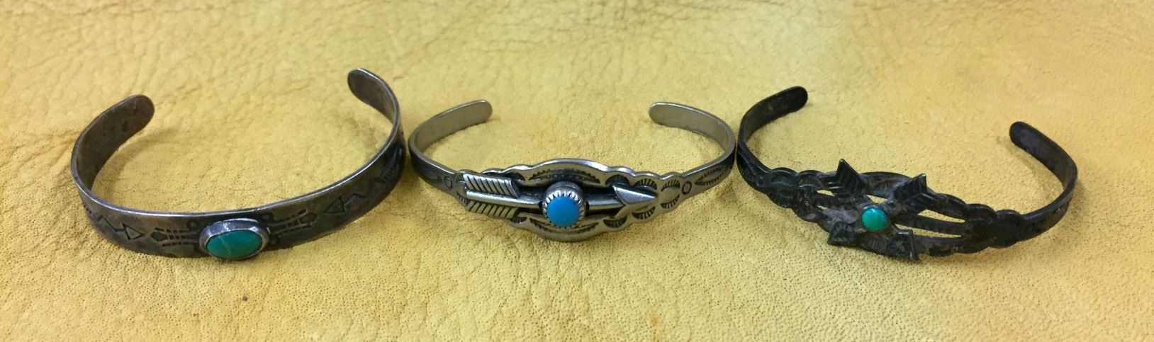 Maker: One has a Bell Trading Post Hallmark, one has the Silver Arrow Hallmark and the other is not marked. Approx. Age: Circa 1940s - 50s. Size: All are a small ladies or children size. Together they weigh 16.4g. Condition: Pretty good for their ages. Additional Info: The Bell Trading Post one is marked Nickel Silver, the other two are sterling. Please look closely at the pictures - they are an important part of our description. Shipping: There will be a $5 handling / packaging fee for shipping this lot. The actual cost of postage will be added on top of that.