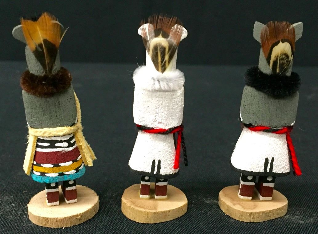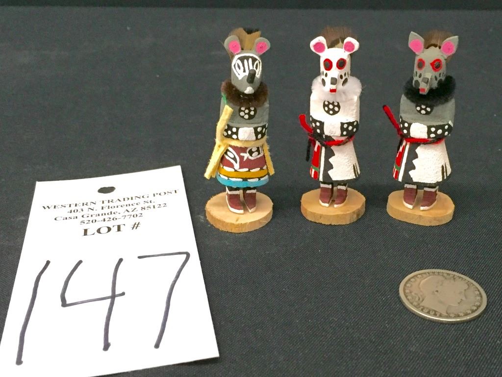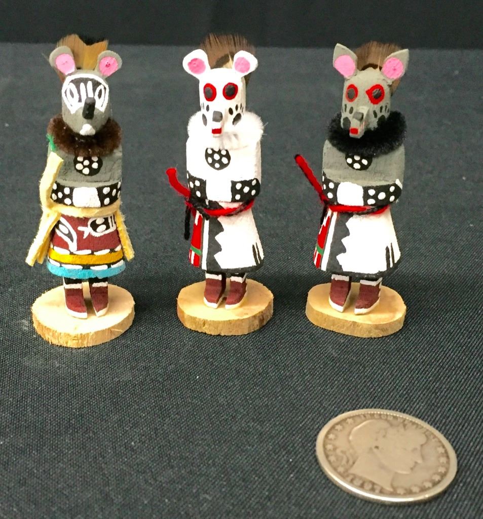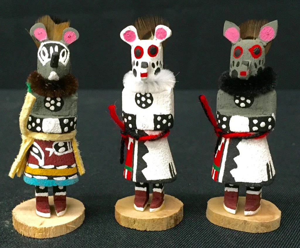 These mini Hopi Kachinas stand approximately 2.5 inches tall each. Made by Loretta Multine. Signed. Please look closely at pics - they are an important part of our description. Shipping: There will be a $5 handling / packaging fee for shipping this lot. The actual cost of postage will be added on top of that.